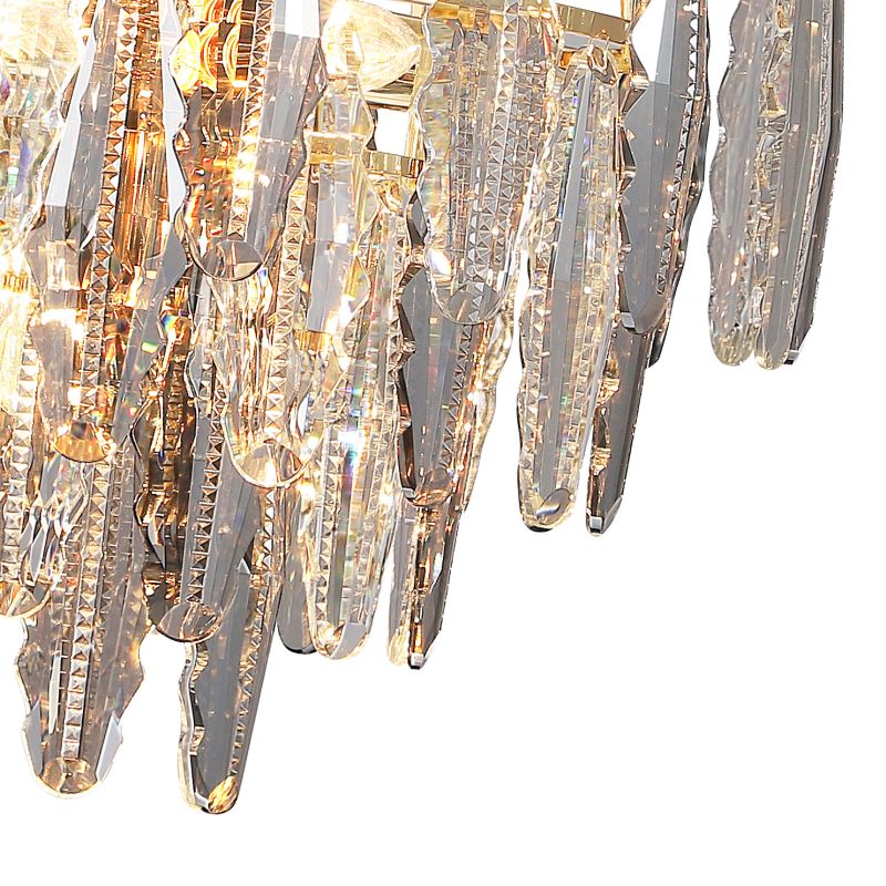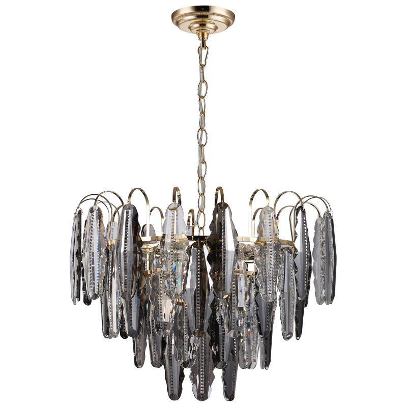 Люстра подвесная из коллекции Florin выполнена из металла, гальванизированного в цвет золота, и декорирована прозрачным и дымчатым хрусталем вытянутой формы высшей категории.