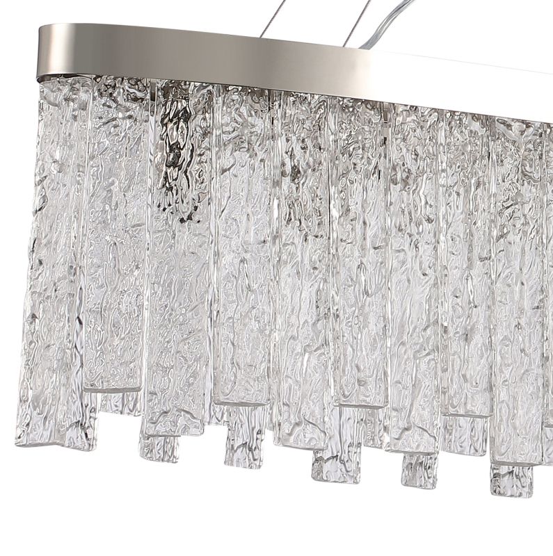 Люстра подвесная вытянутой формы из коллекции Frostyle выполнена из металла, гальванизированного в цвет хрома, и декорирована высококачественным стеклом ручной работы, создающим эффект ледяной свежести. Современная форма светильников и высокое качество идеально подойдут как в классические, так и современные интерьеры.
