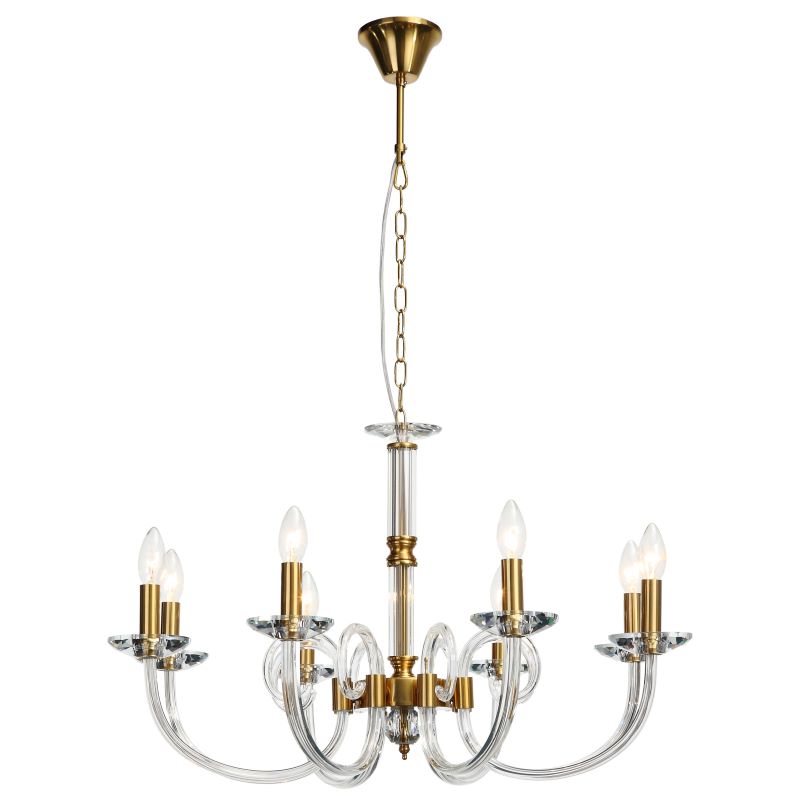 Люстра подвесная из коллекции Glass выполнена из металла, гальванизированного в цвет бронзы. Стеклянные рожки выдуваются вручную. Декоративные розетки выполнены из массива хрусталя ручной калибровки. Премиальное качество и неповторимыи? дизаи?н светильников идеально подои?дут как в классические, так и современные интерьеры.