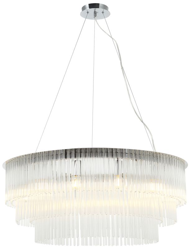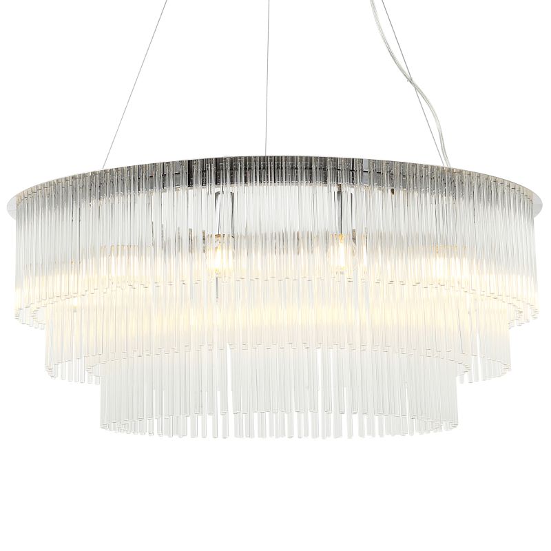 Люстра подвесная из коллекции Imposio выполнена из металла, гальванизированного в цвет хрома. Декор из стеклянных прозрачных трубочек крепится на нержавеющую сталь, отполированную до зеркального блеска. Современная форма и высокое качество светильников идеально подойдут в современные и дизайнерские интерьеры.