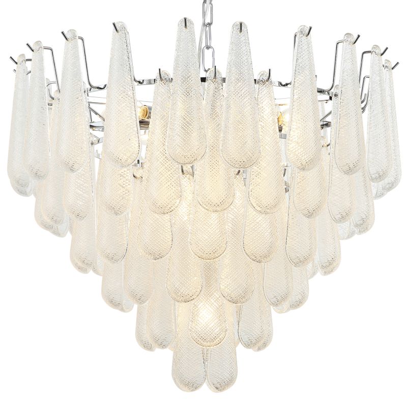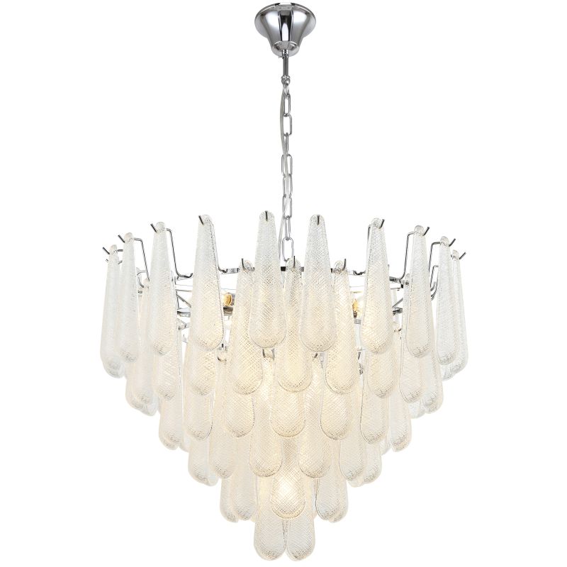 Люстра подвесная из коллекции Prefecto выполнена из металла, гальванизированного в цвет хрома, и декорирована фактурными стеклянными каплевидными подвесками, отлитыми в сложную фактурную форму.