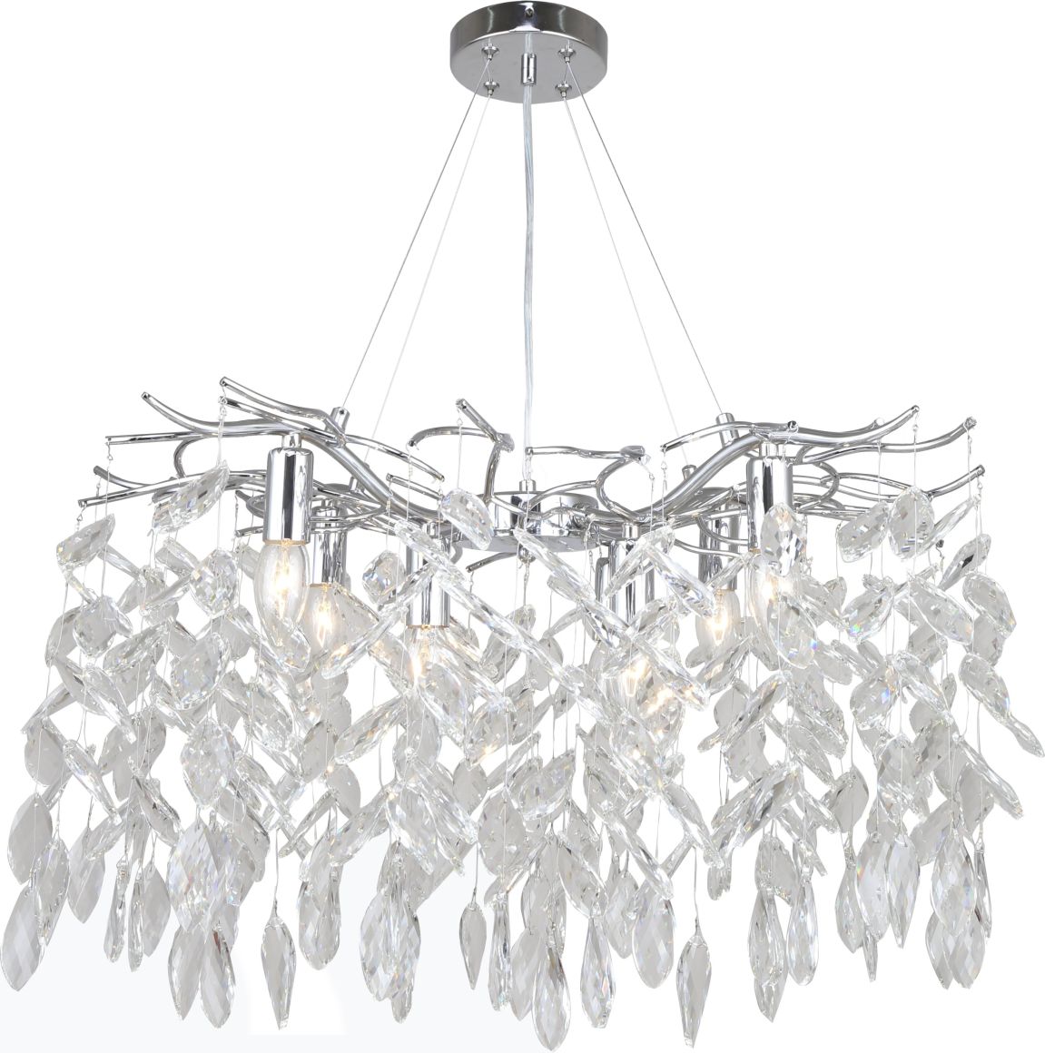 Люстра подвесная коллекции RAMO выполнена из металла, гальванизированного в цвет хрома, и декорирована гроздьями из хрусталя винтажной формы. Отличительной особенностью данной коллекции является ручное изготовление каркаса с дополнительной полировкой стыков арматуры и увеличенным количеством хрустальных подвесок (56 веточек по 5 кристаллов).