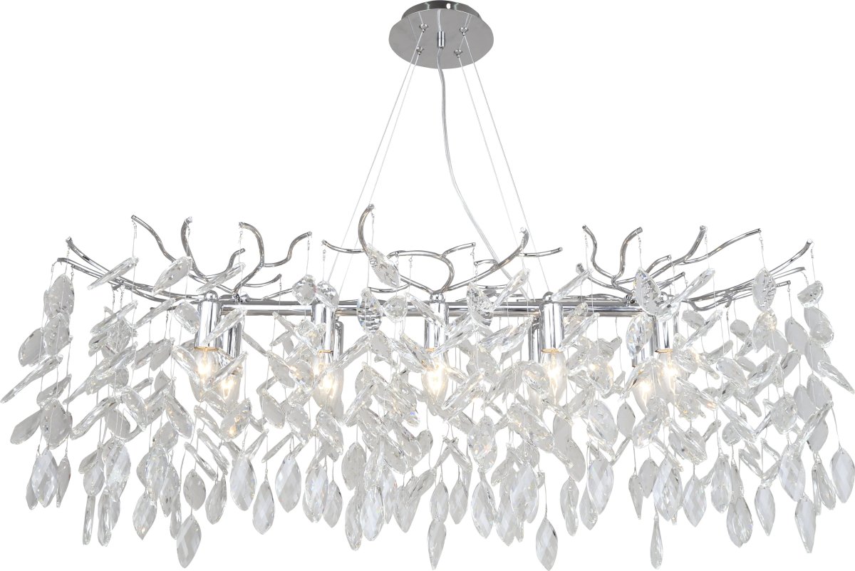Люстра подвесная вытянутой формы коллекции RAMO выполнена из металла, гальванизированного в цвет хрома, и декорирована гроздьями из хрусталя винтажной формы. Отличительной особенностью данной коллекции является ручное изготовление каркаса с дополнительной полировкой стыков арматуры и увеличенным количеством хрустальных подвесок (69 веточек по 5 кристаллов).