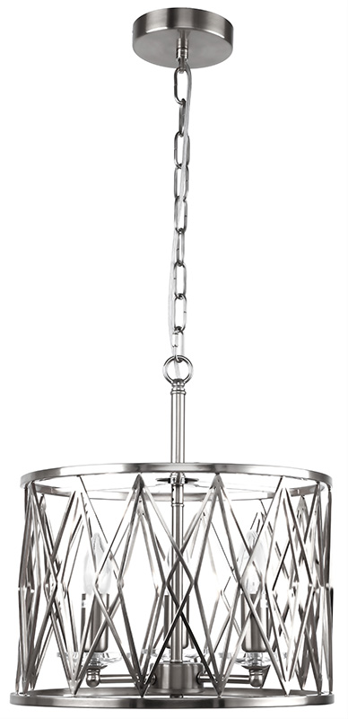 Люстра подвесная из коллекции Rombik выполнена из металла, гальванизированного в цвет глянцевого никеля, и декорирована оригинальными металлическими элементами, напоминающими ромбы. Декоративные розетки выполнены из массива хрусталя ручной калибровки.