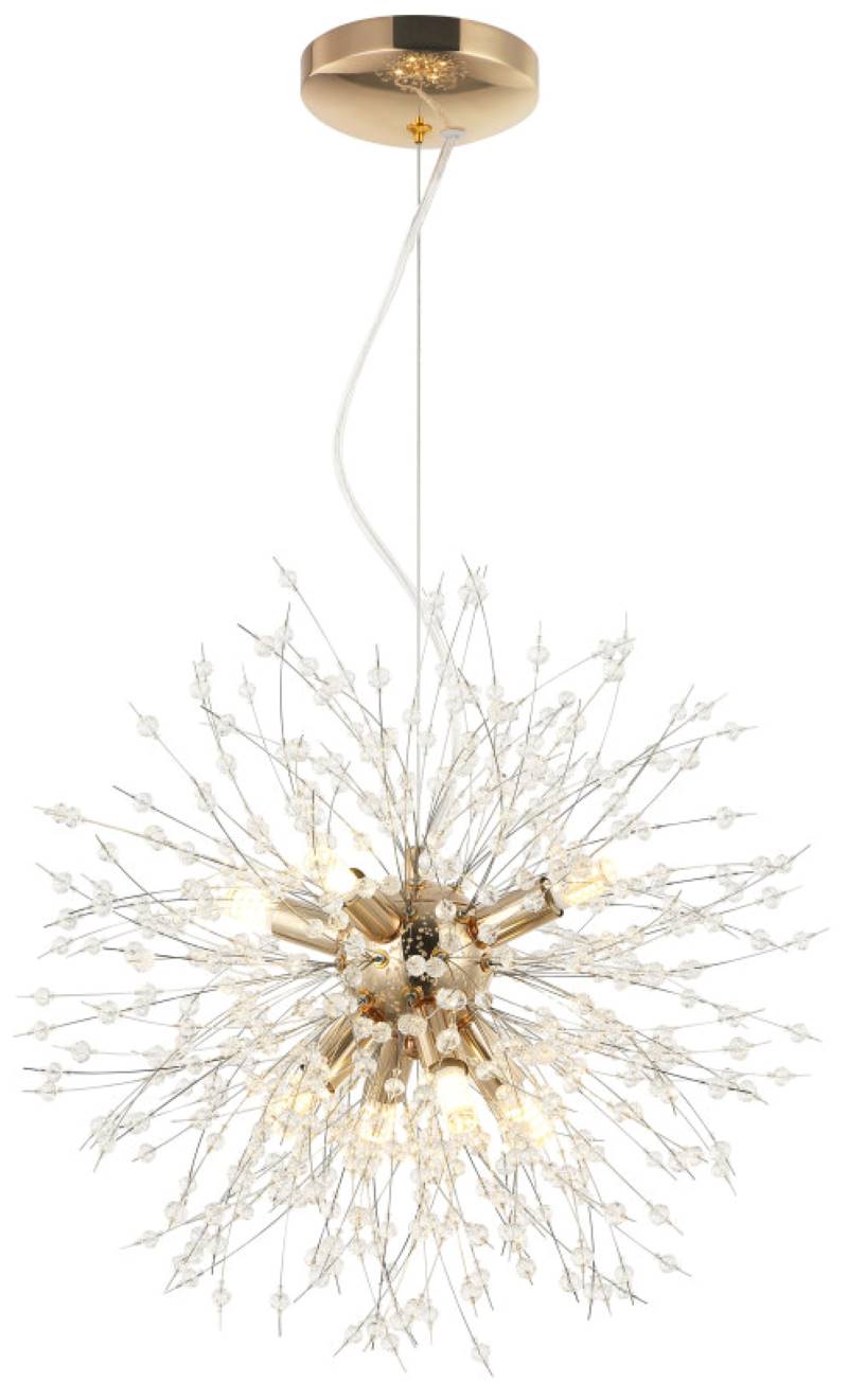 Люстра подвесная из коллекции Salut выполнена из металла, гальванизированного в цвет золота, и декорирована хрустальными бусинами, имитирующими салют.