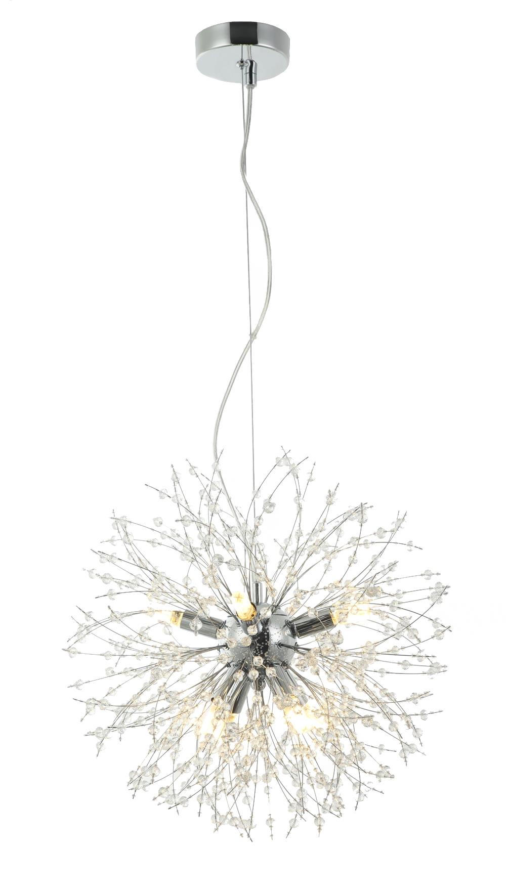 Люстра подвесная из коллекции Salut выполнена из металла, гальванизированного в цвет хрома, и декорирована хрустальными бусинами, имитирующими салют.