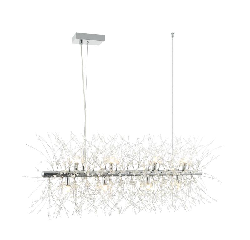 Люстра подвесная вытянутой формы из коллекции Salut выполнена из металла, гальванизированного в цвет хрома, и декорирована хрустальными бусинами, имитирующими салют.