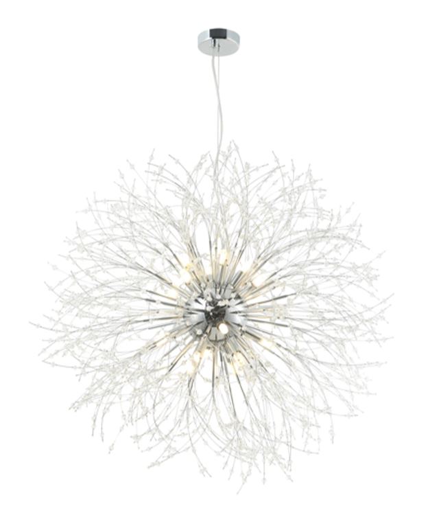 Люстра подвесная из коллекции Salut выполнена из металла, гальванизированного в цвет хрома, и декорирована хрустальными бусинами, имитирующими салют.