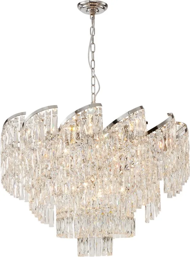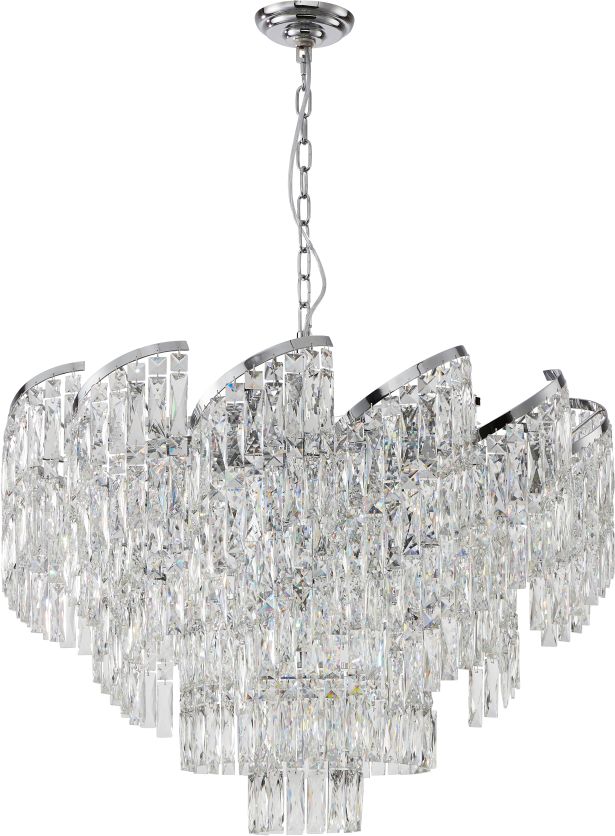 Люстра подвесная из коллекции Sapparo выполнена из металла, гальванизированного в цвет хрома, и декорирована хрусталем вытянутой формы высшей категории. Хрусталь многослойно располагается на изогнутых металлических элементах в виде спирали. Современная форма и высокое качество светильников идеально подойдут как в классические, так и современные интерьеры. Из данной коллекции светильников можно сделать индивидуальный заказ любого цвета и размера.