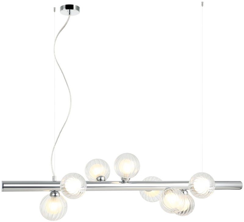 Люстра подвесная вытянутой формы из коллекции Shardin выполнена из металла, гальванизированного в цвет хрома, и декорирована двойными плафонами из прозрачного внешнего стекла с линейным рисунком и внутреннего белого матового.
