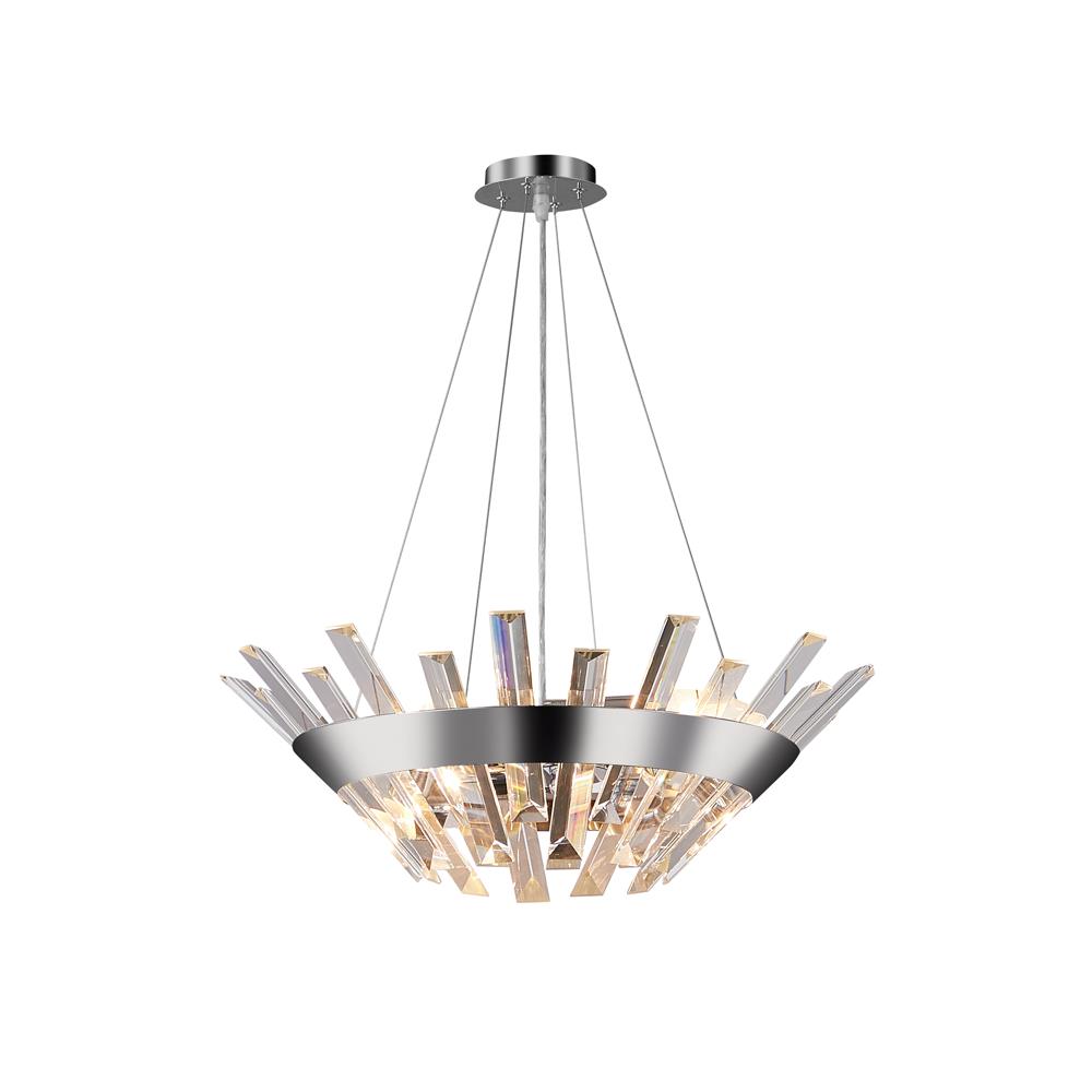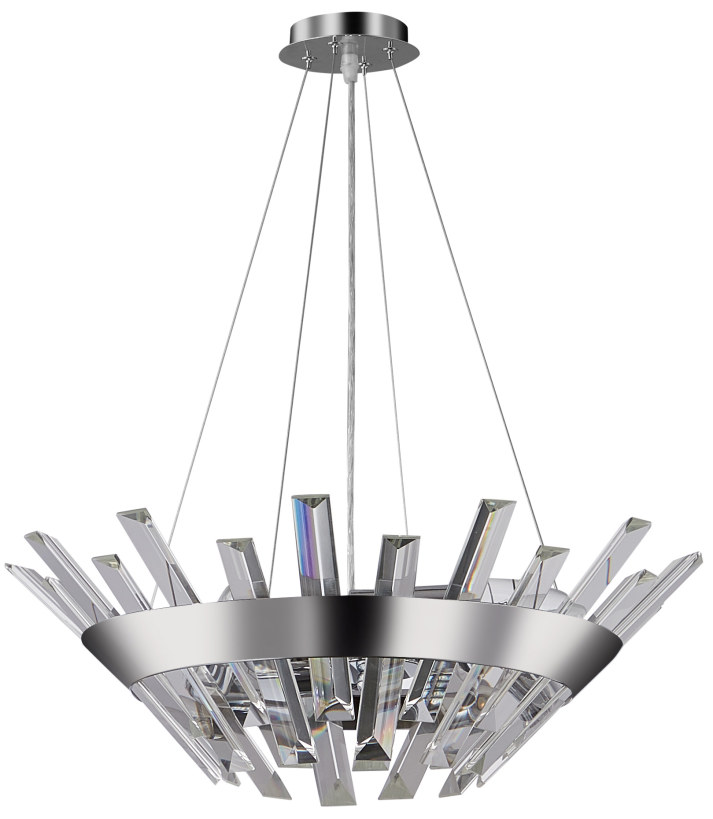 Люстра подвесная из коллекции Snowy выполнена из металла, гальванизированного в цвет хрома, и декорирована прозрачным хрусталем высшей категории прямоугольной формы разных размеров. Уникальный дизайн придает светильнику элегантность.