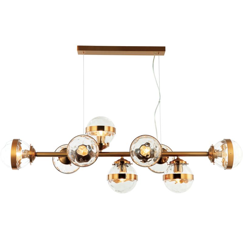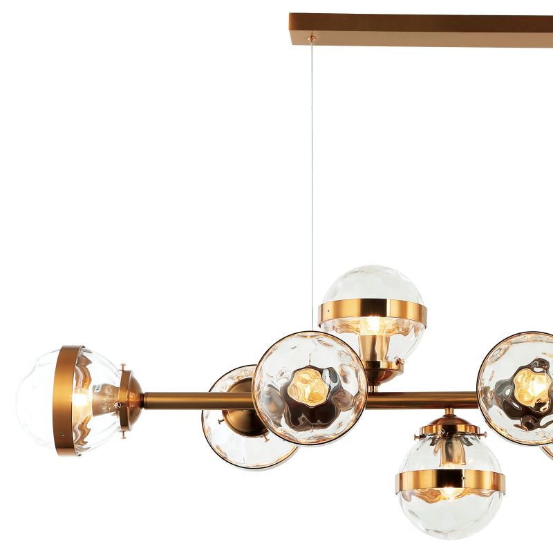 Люстра подвесная вытянутой формы из коллекции Sogno выполнена из металла, гальванизированного в цвет бронзы, и декорирована плафонами из прозрачного стекла, имитирующего вулканическое стекло. По центру плафоны отделаны металлическим кантом, гальванизированным в цвет арматуры. Люстра выглядит стильно и респектабельно. Премиальное качество и неповторимыи? дизаи?н светильников идеально подои?дут в современные и дизайнерские интерьеры.