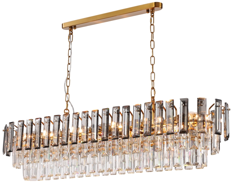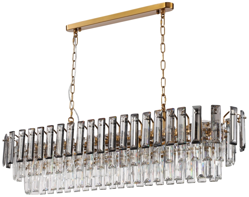 Люстра подвесная вытянутой формы из коллекции Ton выполнена из металла, гальванизированного в цвет бронзы, и декорирована прозрачным и дымчатым хрусталем высшей категории прямоугольной формы. Люстра выглядит респектабельно и современно.