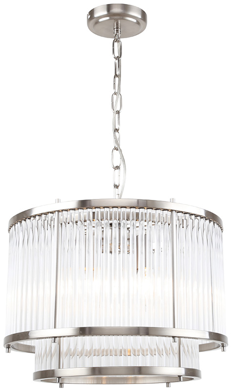 Люстра подвесная из коллекции Two-one выполнена из металла, гальванизированного в цвет никеля, и декорирована стеклянными трубочками. Каркас люстры отделан металлическими кантами и дополнительно закрепленными металлическими стержнями, гальванизированными в цвет арматуры.