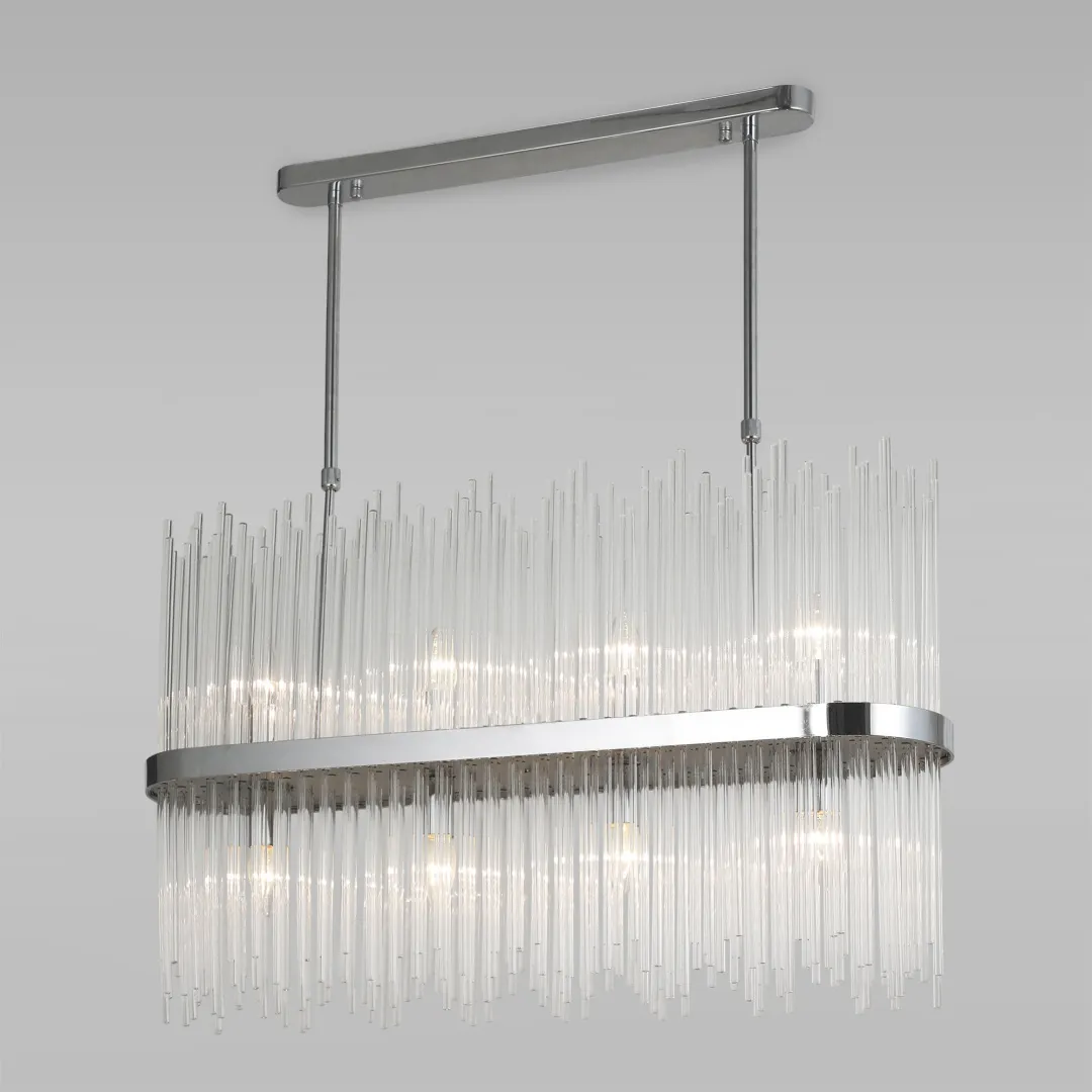 Декоративные стеклянные трубочки и сменные лампы с цоколем E14 переливаются на свету искристыми завораживающими бликами. В производстве подвесной люстры использовали особое стекло с эффектной огранкой и высококачественный металл с надежным защитным покрытием.