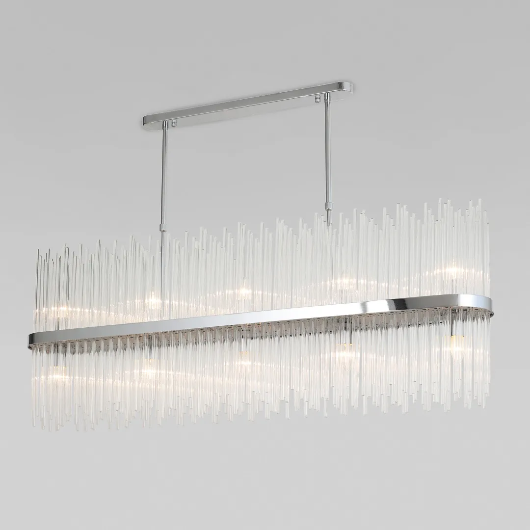 Декоративные стеклянные трубочки и сменные лампы с цоколем E14 переливаются на свету искристыми завораживающими бликами. В производстве подвесной люстры использовали особое стекло с эффектной огранкой и высококачественный металл с надежным защитным покрытием.