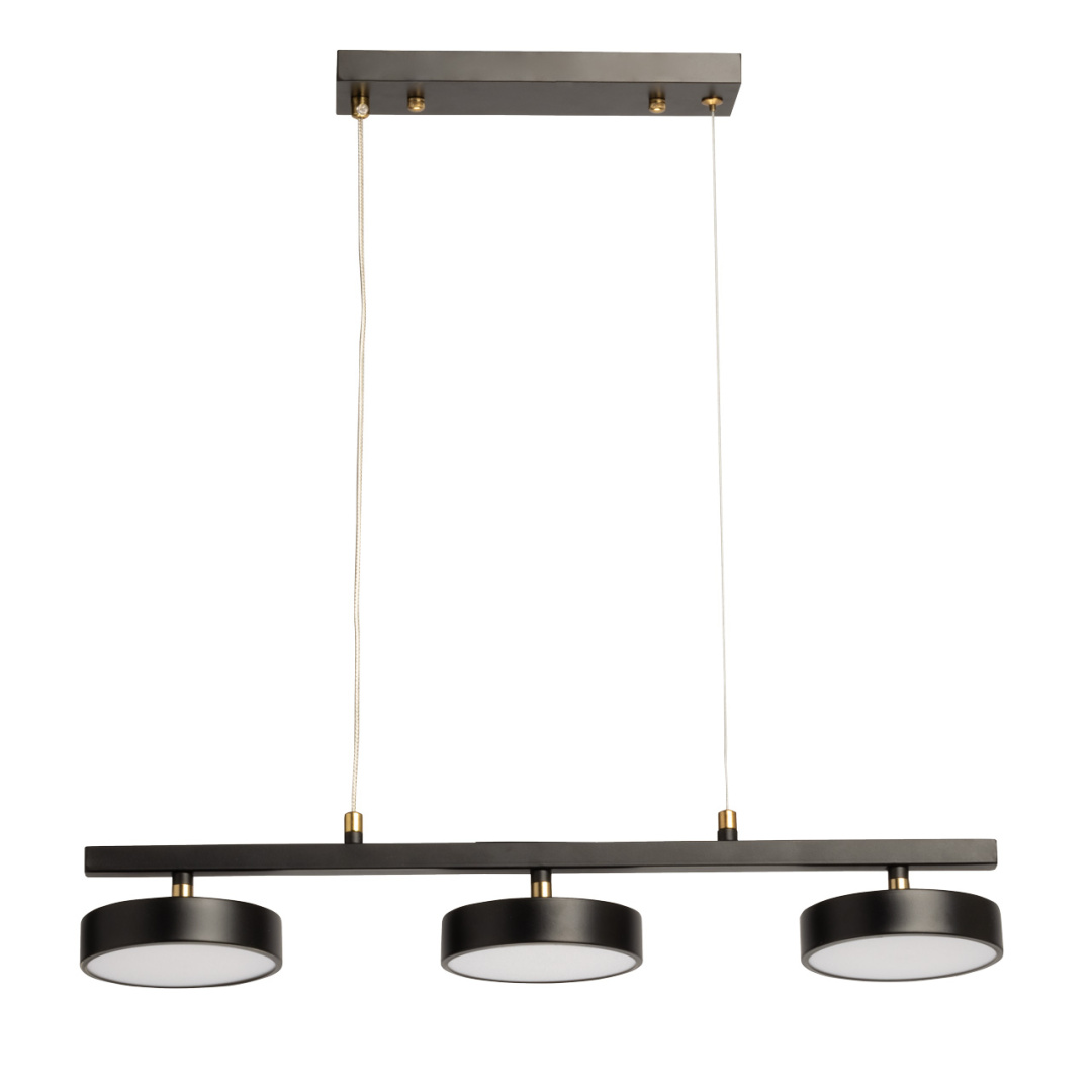 Подвесной светильник Гэлэкси из коллекции с одноименным названием – это идеальное решение для тех, кто ценит лаконичный дизайн и функциональность. Предназначенный для общего освещения помещений площадью до 12 квадратных метров, он превращает обычное освещение в стильный акцент, идеально вписывающийся в концепцию лофт или хай-тек.Гэлэкси – это гармоничное сочетание строгости и изысканности. Его корпус выполнен из металла, окрашенного в глубокий, благородный черный цвет. Некоторые элементы светильника подвергнуты гальванизации, что придает им мягкий, теплый отблеск бронзы, приятно контрастирующий с матовым черным. Светильник оснащен тремя плафонами, расположенными таким образом, чтобы обеспечить равномерное освещение помещения. Источники света – современные светодиоды, известные своей энергоэффективностью и долгим сроком службы. Светодиоды надежно защищены белым акриловым рассеивателем, который мягко рассеивает свет, создавая комфортную и уютную атмосферу. С помощью настенного выключателя есть возможность менять температуру освещения от 3000-6000K.