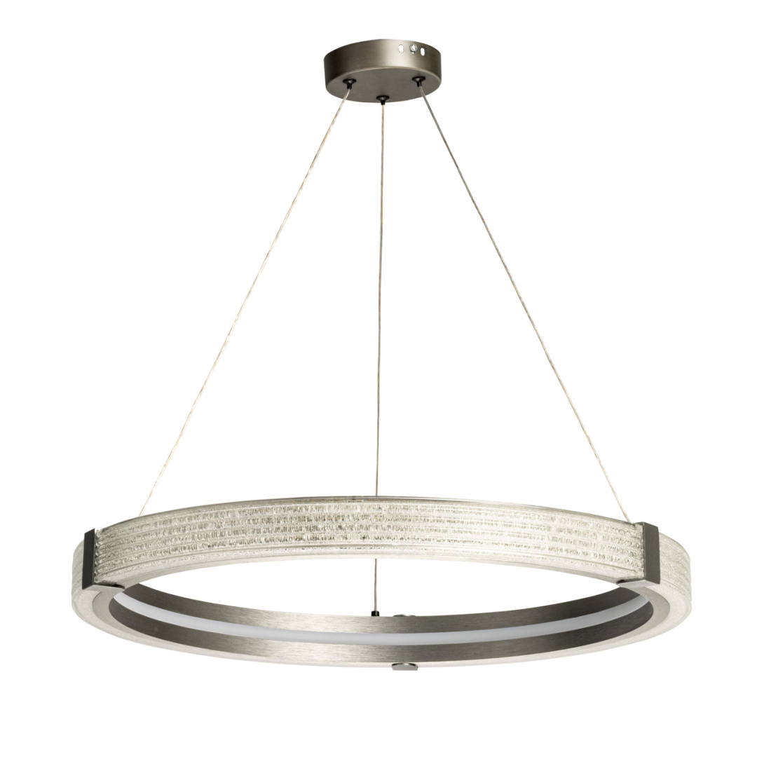 Основное внимание в светильнике Платлинг привлекает массивное кольцо, выполненное из металла. Это кольцо не только служит основой светильника, но и является его декоративным элементом. Гальванизированная отделка в лаконичном сером матовом цвете придаёт изделию современный вид, который гармонично вписывается в минималистичные интерьеры. Конструкция кольца позволяет равномерно освещать как внутреннюю, так и внешнюю его часть, создавая мягкое и комфортное освещение.Внутри кольца расположены встроенные светодиоды, которые обеспечивают мощность в 50 Вт. Это достаточно для освещения пространства площадью до 18 квадратных метров, что делает светильник Платлинг идеальным выбором как для жилых помещений, так и для офисов или публичных пространств. Светодиоды закрыты акриловым рассеивателем с акриловой крошкой, имитирующей стекло. Это решение не только придаёт светильнику изысканный вид, но и способствует красивому распределению света.Одной из ключевых особенностей светильника Платлинг является возможность регулировки температуры света. С помощью настенного выключателя можно изменять цветовую температуру в диапазоне от 3000 до 6000 К. Это позволяет адаптировать освещение под различные нужды: от тёплого света для создания уюта до холодного для продуктивной работы. Такая функция делает светильник универсальным решением для различных ситуаций и настроений.Светильник Платлинг станет отличным дополнением для современных лаконичных интерьеров. Его стильный и минималистичный дизайн прекрасно сочетается с другими элементами хай-тек стиля, такими как стекло, металл и бетон.