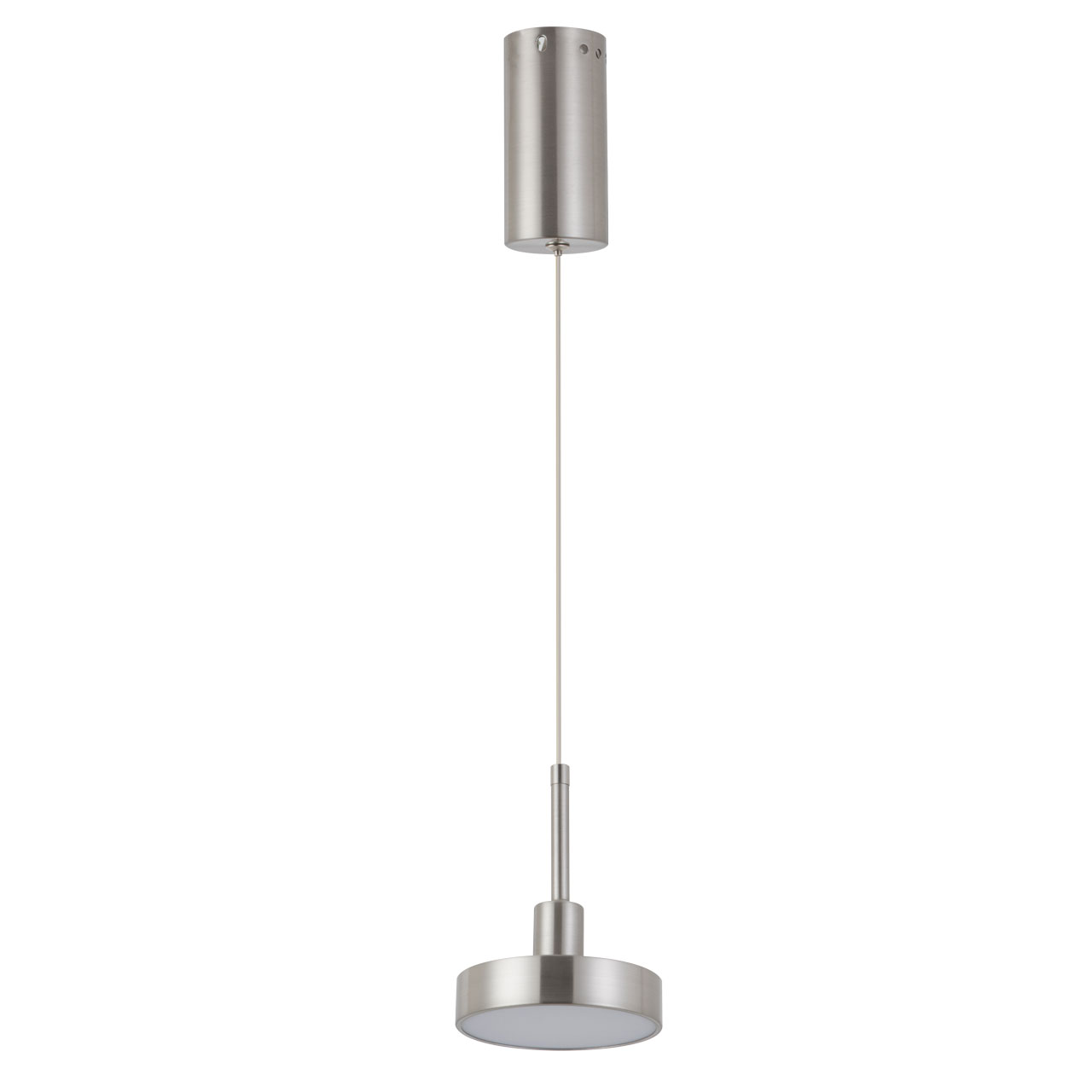 Металлическое основание подвеса гальванизировано в цвет никеля. Корпус плафона выполнен из сплава алюминия и гальванизирован в цвет основания. Светодиодный источник света закрыт матовым акрилом.