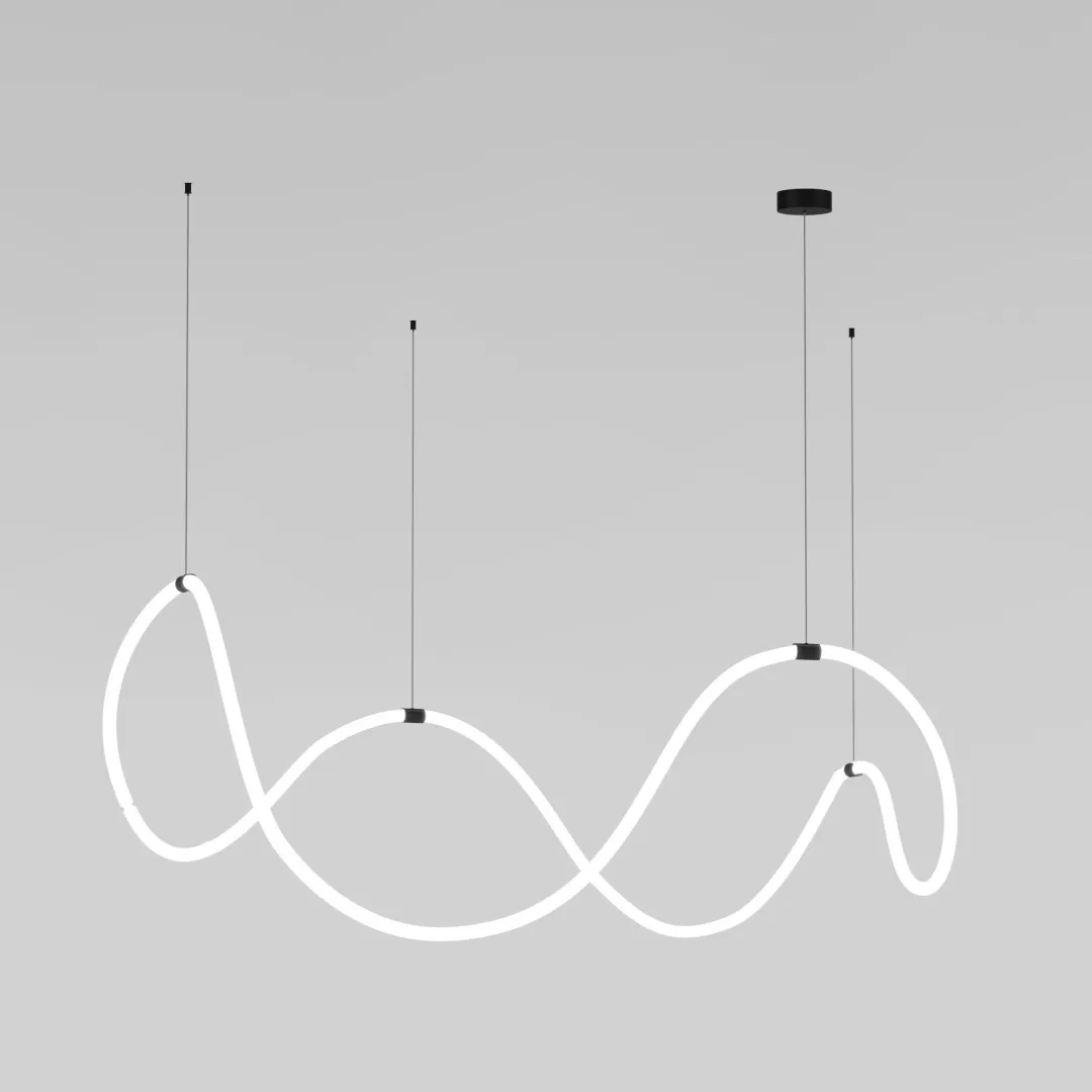 Крепление в черном цвете можно установить в любых точках потолочного пространства и создать необходимую высоту светильника. Световой элемент за счет двойной LED-ленты излучает свет всей своей поверхностью, угол света 360°. С помощью пульта управления можно регулировать яркость и цветовую температуру, доступную в трех значениях: 3300, 4200 и 6500 К.