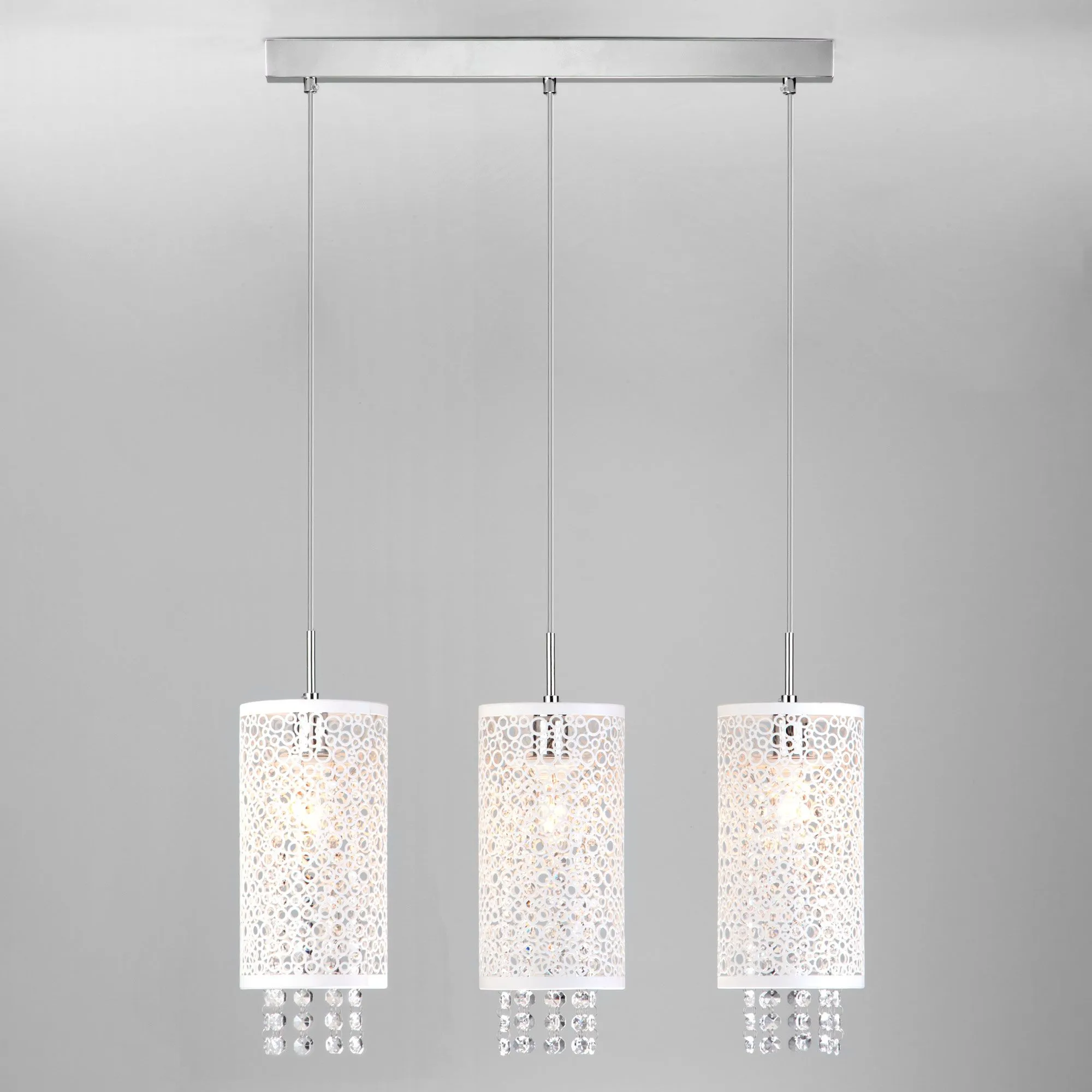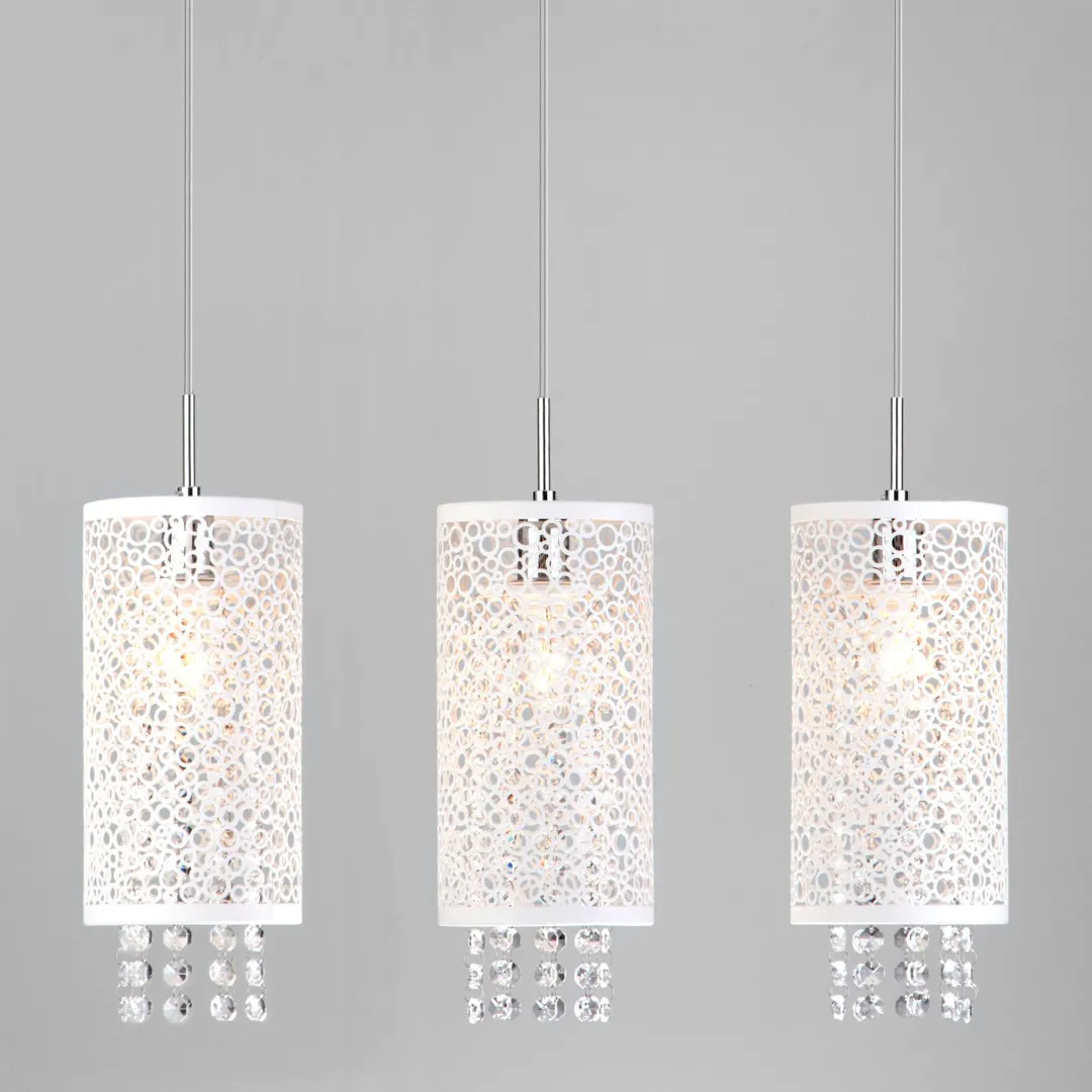 Светильник с металлическими плафонами белого цвета, украшен декоративным хрусталем, оснащен системой регулировки высоты подвеса, позволяющей размещать изделие на разных уровнях, уменьшая или увеличивая угол рассеивания светового потока. Данный светильник легко устанавливается на потолке при помощи монтажной планки.