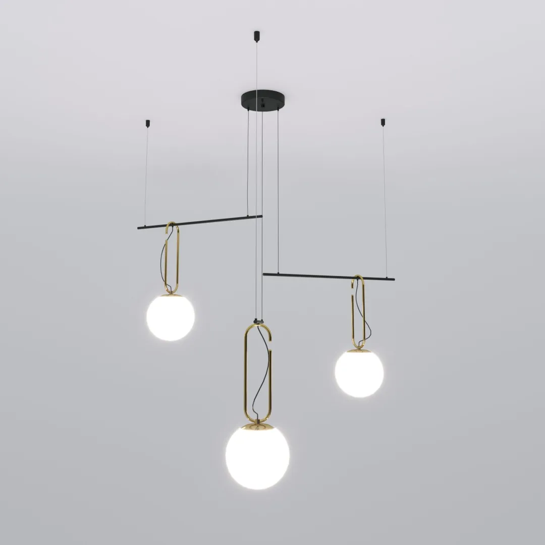 Светильник со стеклянными плафонами оборудован системой регулировки высоты подвеса, позволяющей размещать изделие на разных уровнях, уменьшая или увеличивая угол рассеивания светового потока. Подвесной светильник просто устанавливается на натяжных потолках при помощи монтажной планки.