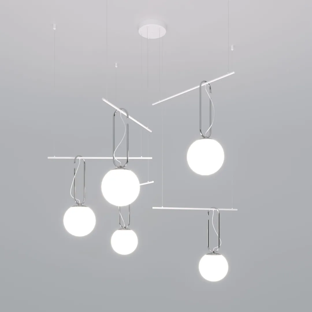 Светильник со стеклянными плафонами оборудован системой регулировки высоты подвеса, позволяющей размещать изделие на разных уровнях, уменьшая или увеличивая угол рассеивания светового потока. Подвесной светильник просто устанавливается на натяжных потолках при помощи монтажной планки.