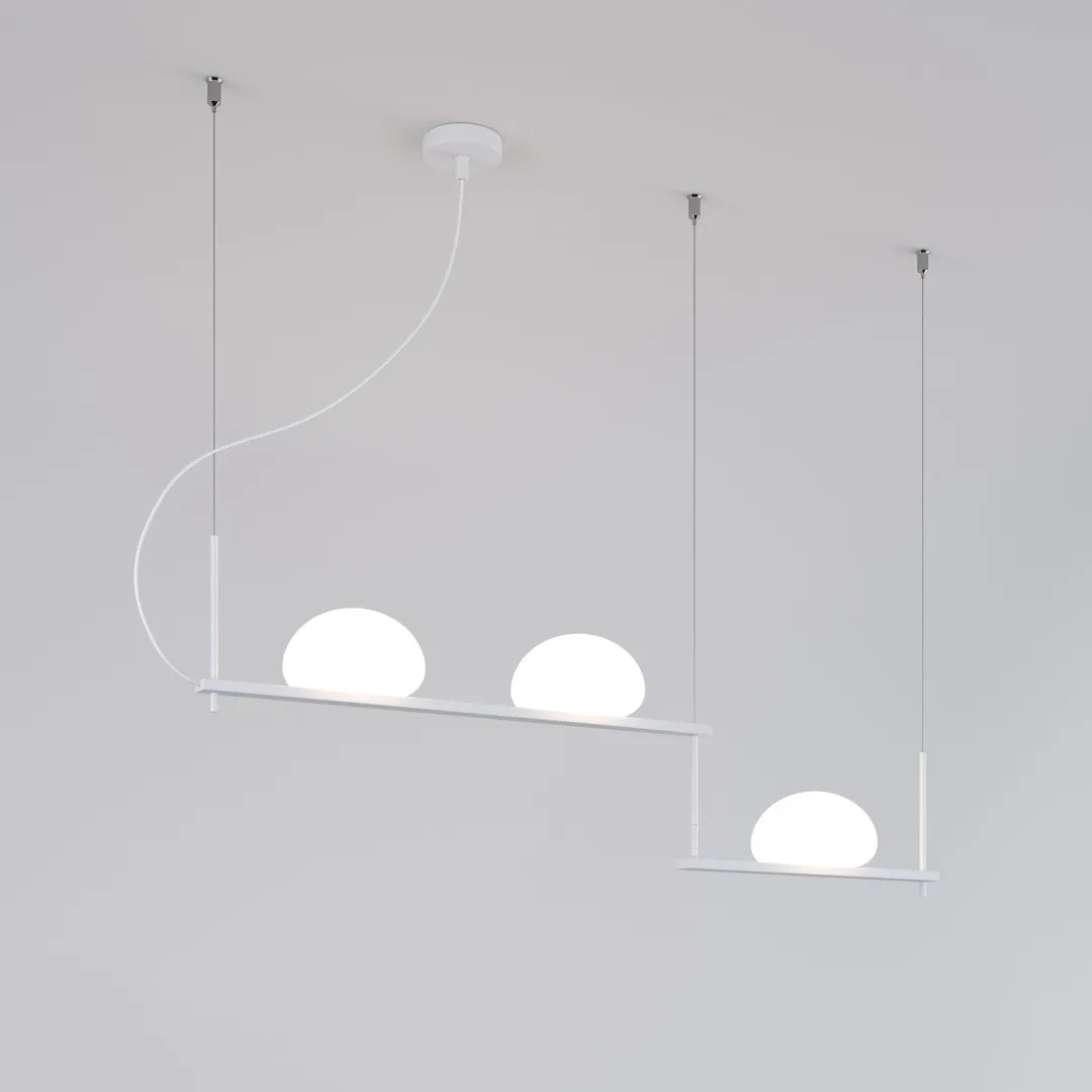 Светильник со стеклянными плафонами оснащен системой регулировки высоты подвеса, позволяющей размещать изделие на разных уровнях, уменьшая или увеличивая угол рассеивания светового потока. Подвесной светильник легко устанавливается на натяжных потолках при помощи монтажной планки.