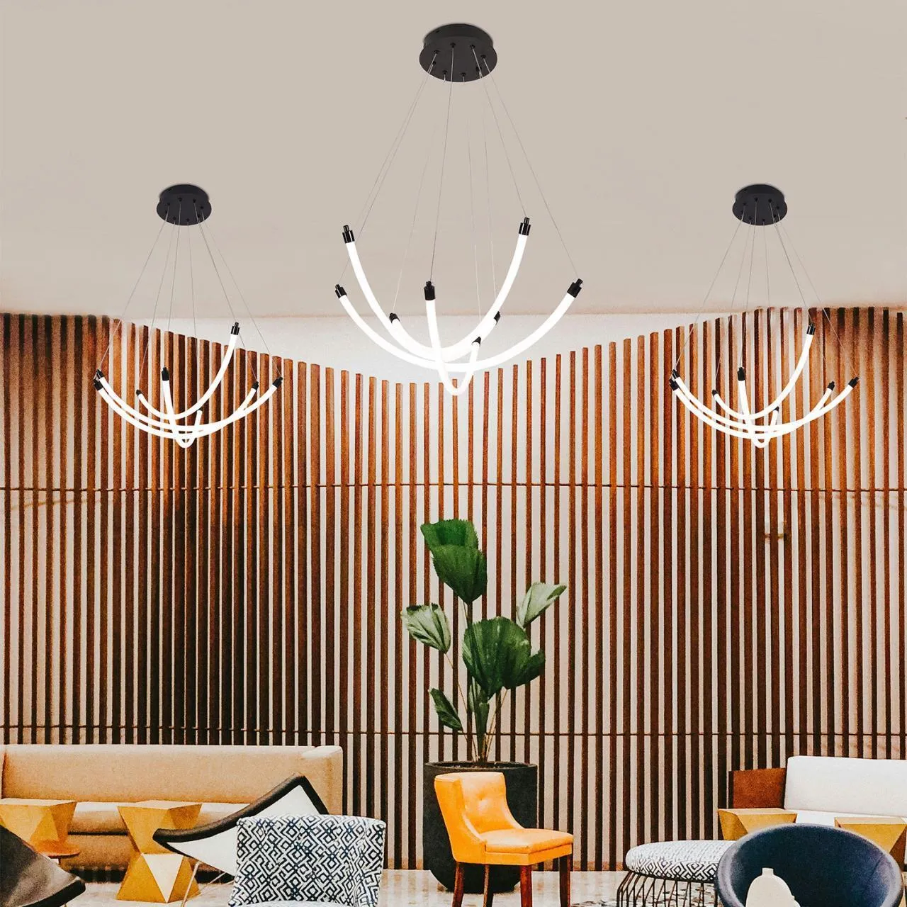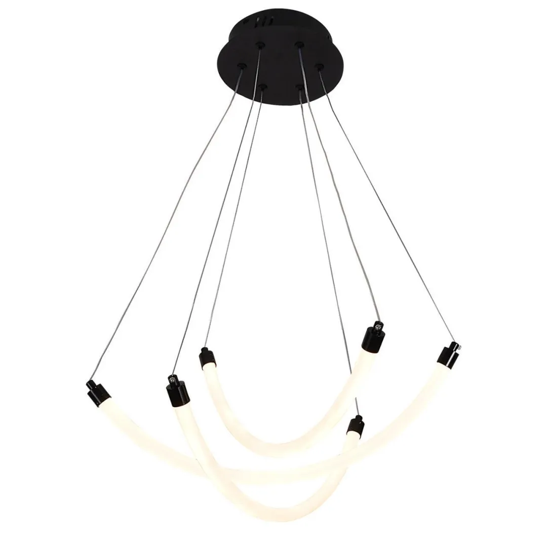Металлический каркас черного цвета с четырьмя закругленными гибкими акриловыми трубками белого цвета, источником света служат встроенные ленты LED с круговым расположением светодиодов внутри, регулируемая высота, пульт управления регулирует мощность и температуру света.