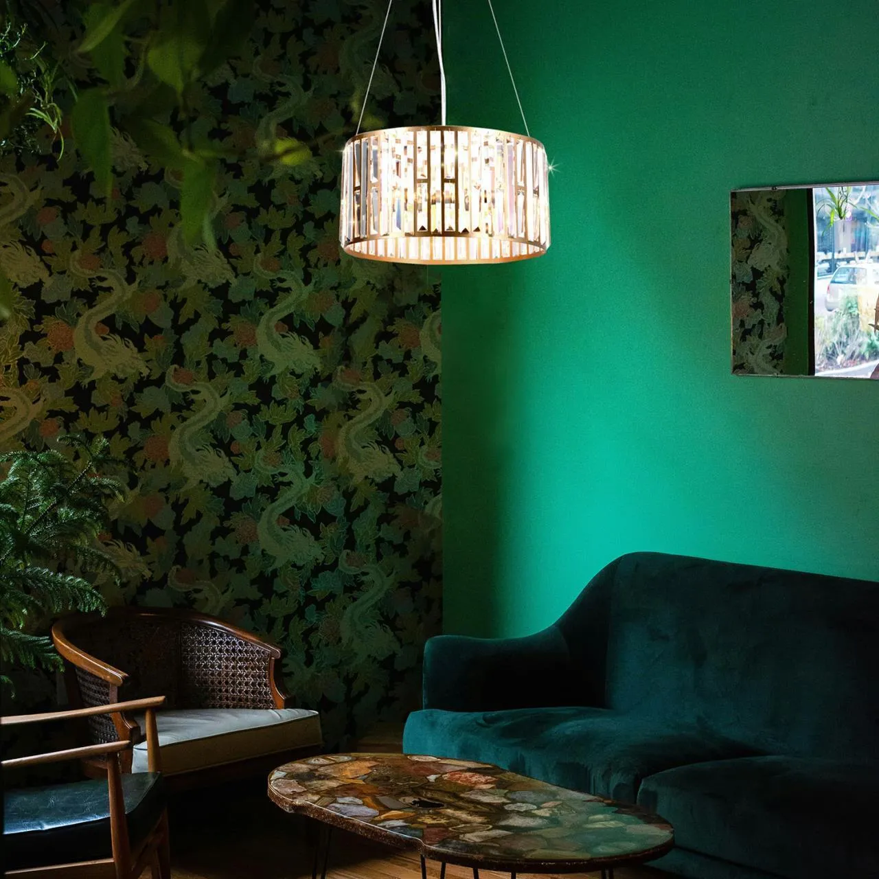 Металлический каркас золотого цвета с кольцом из чередующихся длинных и коротких металлических рамок, в которые инкрустированы прозрачные кристаллы трапециевидной формы. Цоколь E14, регулируемая высота.