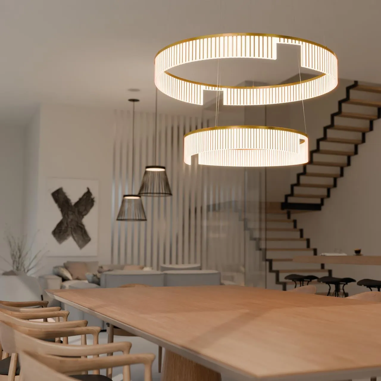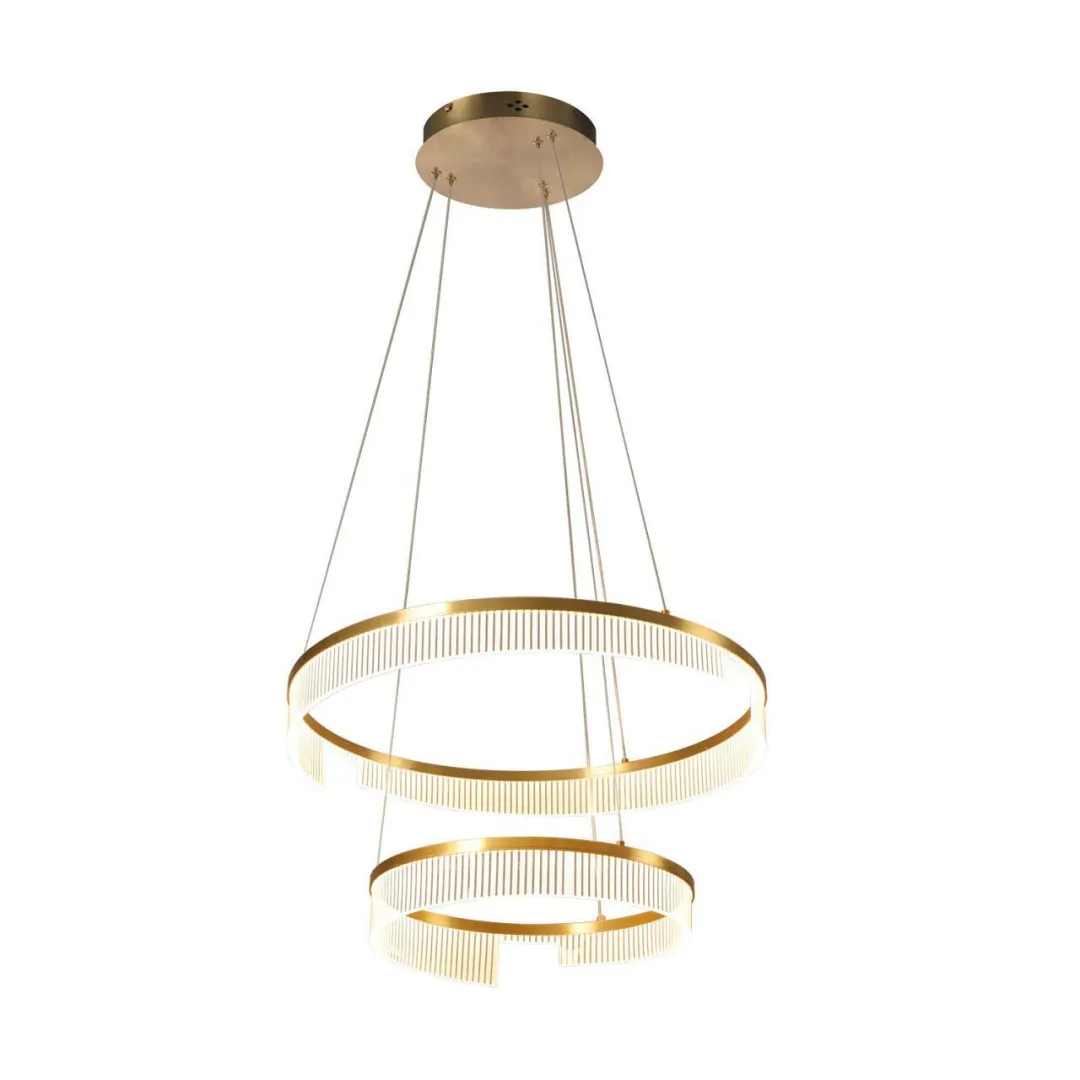 Каркас из двух металлических колец разного диаметра в золотом цвете, рассеиватель из прозрачного акрила с узором, встроенные LEDленты по периметрам колец.