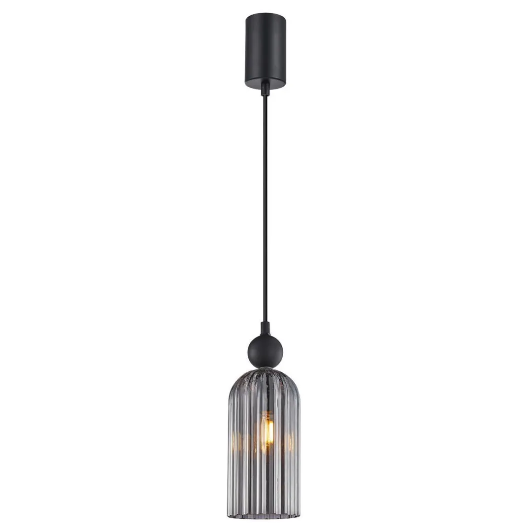 Металлический каркас черного цвета, плафон из фактурного стекла дымчатосерого цвета, декоративный металлический шар черного цвета, регулируемая высота, цоколь Е14.