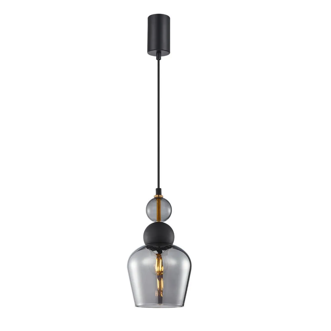 Металлический каркас черного цвета, выдувной плафон из дымчатосерого стекла, декоративный элемент в черном цвете, цоколь E27, регулируемая высота.
