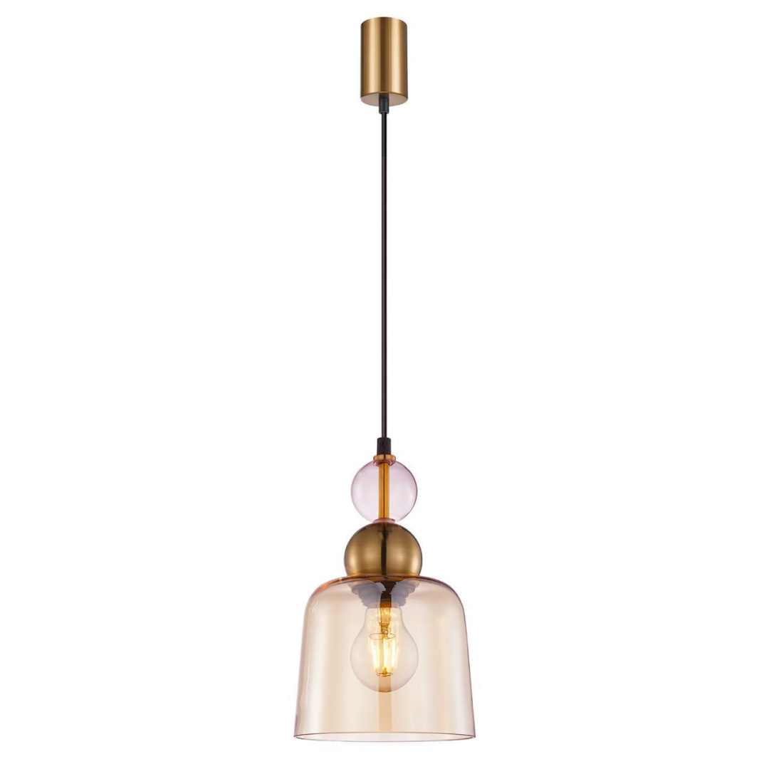 Металлический каркас в цвете латунь, выдувной плафон из янтарного стекла, декоративный элемент в розовом и латунном цвете, цоколь E27, регулируемая высота.