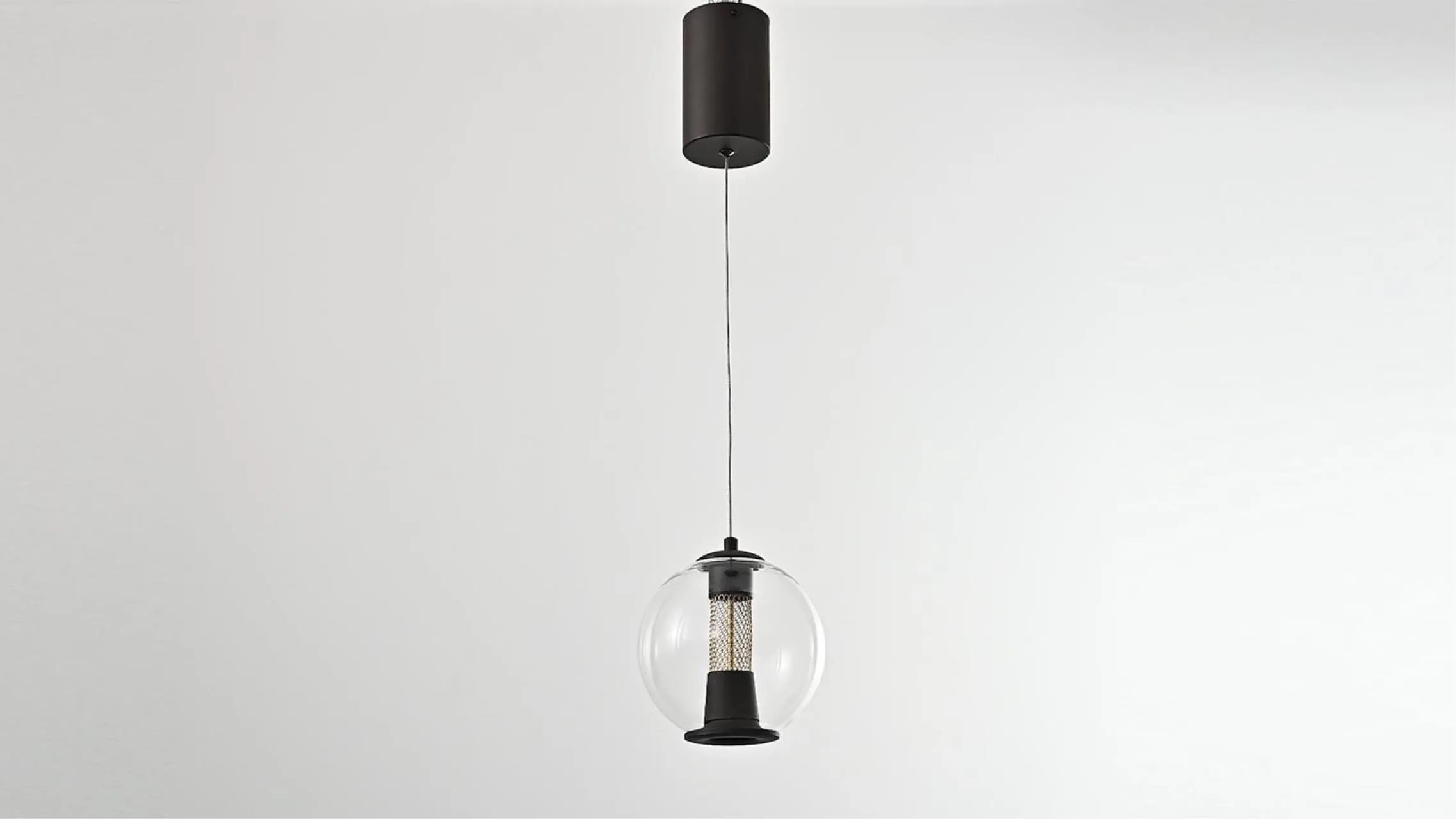 Металлический каркас черного цвета, конструкция плафона включает в себя выдувное стекло, украшенное внутренней декоративной металлической решеткой, модуль LED, регулируемая высота.