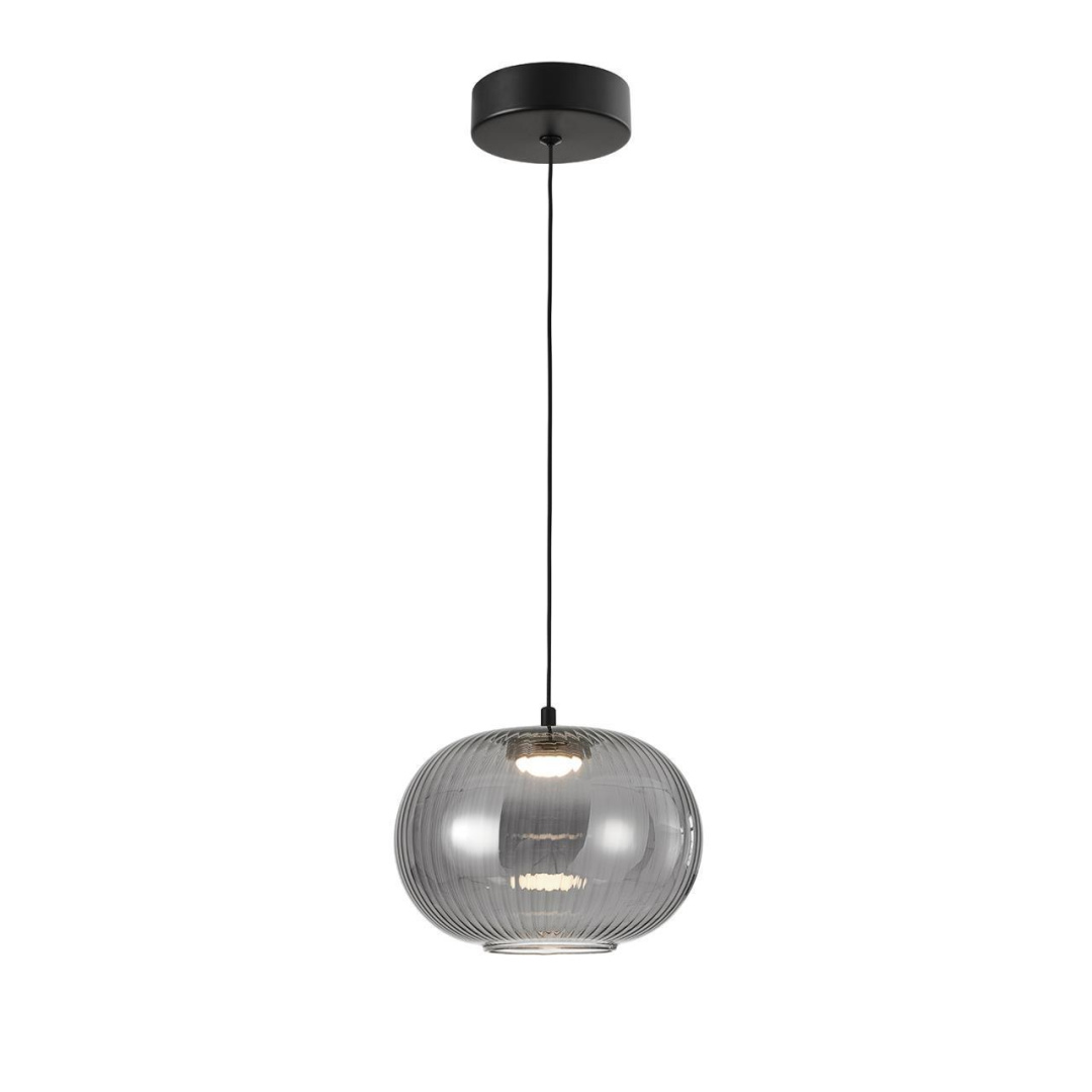 Металлический каркас черного цвета, с выдувным плафоном в виде сферы, в светлом дымчатосером цвете , LEDмодуль, регулируемая высота.