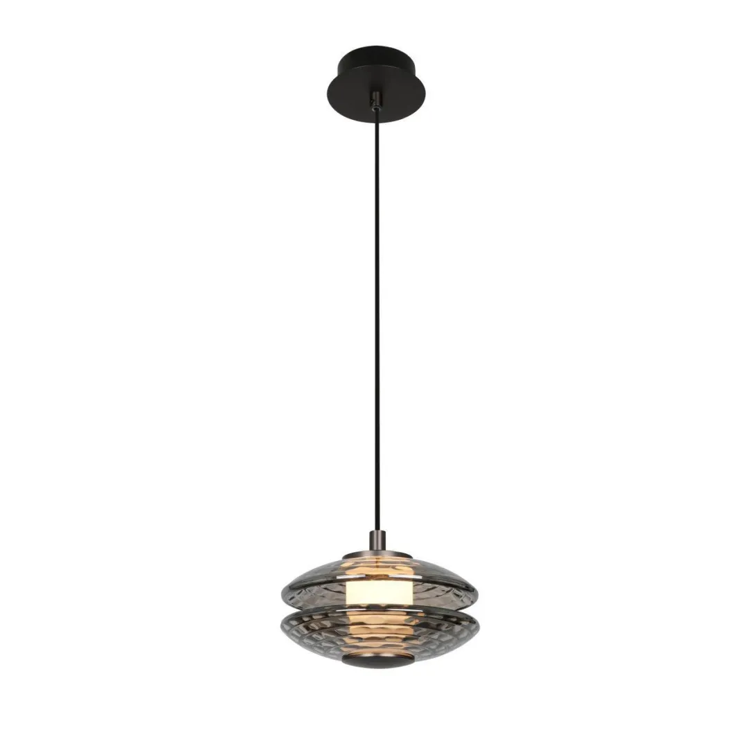 Металлический каркас черного матов цвета, закругленный фактурный плафон из из стекла дымчатосерого цвета, регулируемая высота, LEDмодуль.