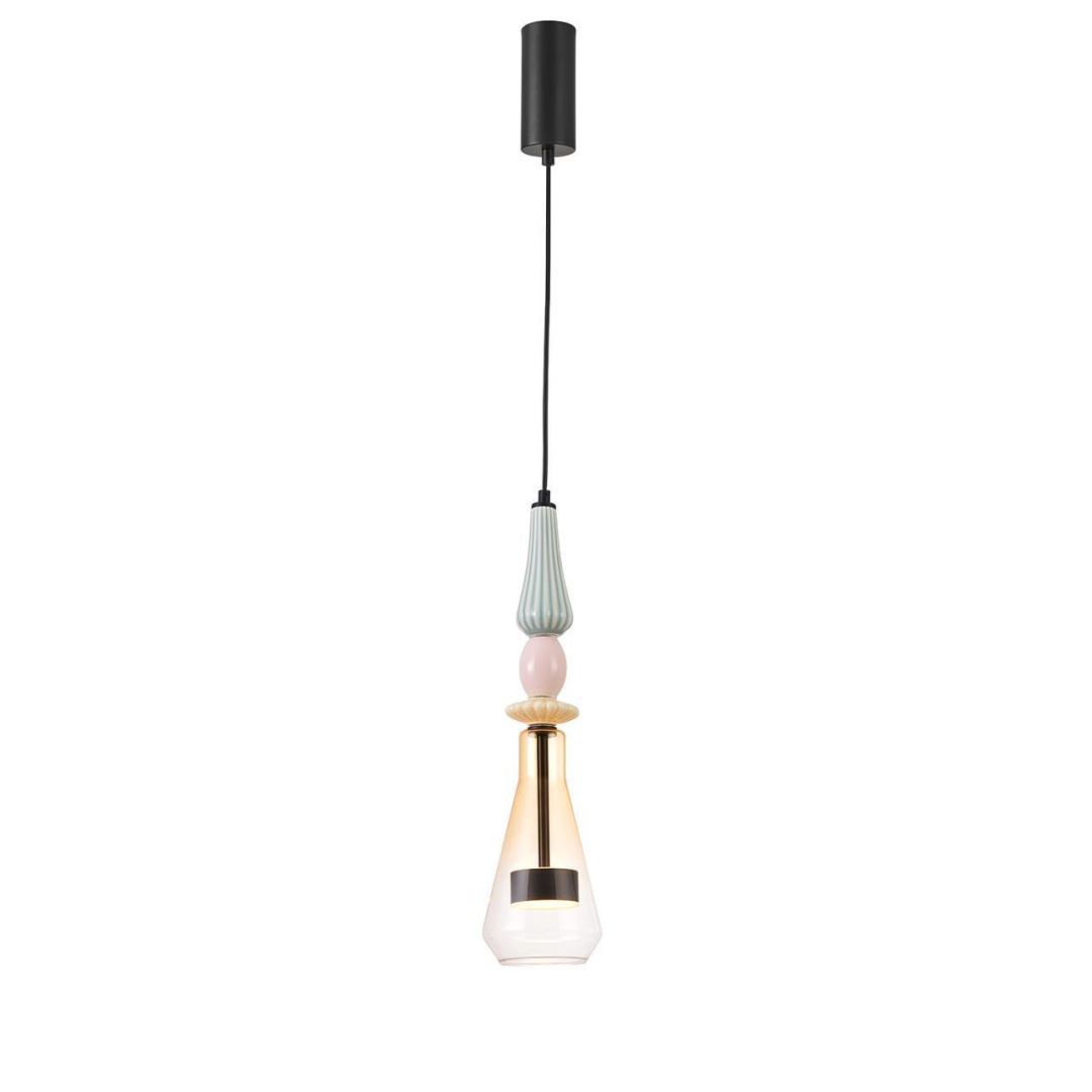Металлический каркас черного цвета, плафон с градиентным переходом из прозрачного в янтарный цвет, изготовлен из выдувного стекла, декорирован керамическими глазурованными элементами, встроенный модуль LED, регулируемая высота.