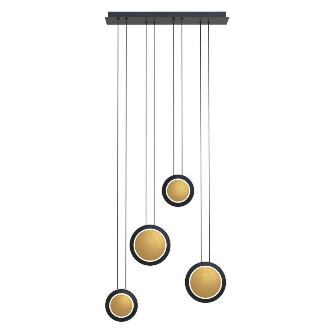 Потолочная люстра с каркасом в черном цвете, с 4 плафонами в форме дисков различных размеров в цвете латуни с черным кантом. Каждый диск оснащен тремя встроенными лентами LED, подвешен на двух параллельных струнах и имеет регулируемую высоту.