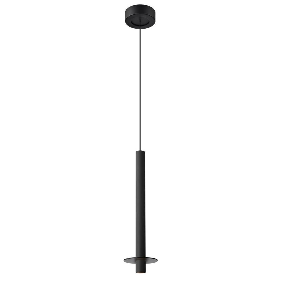 Металлический каркас черного цвета, плафон из алюминия в форме тонкого удлиненного цилиндра в черном цвете, в нижней части подвеса расположен светодиодный источник света, регулируемая высота.