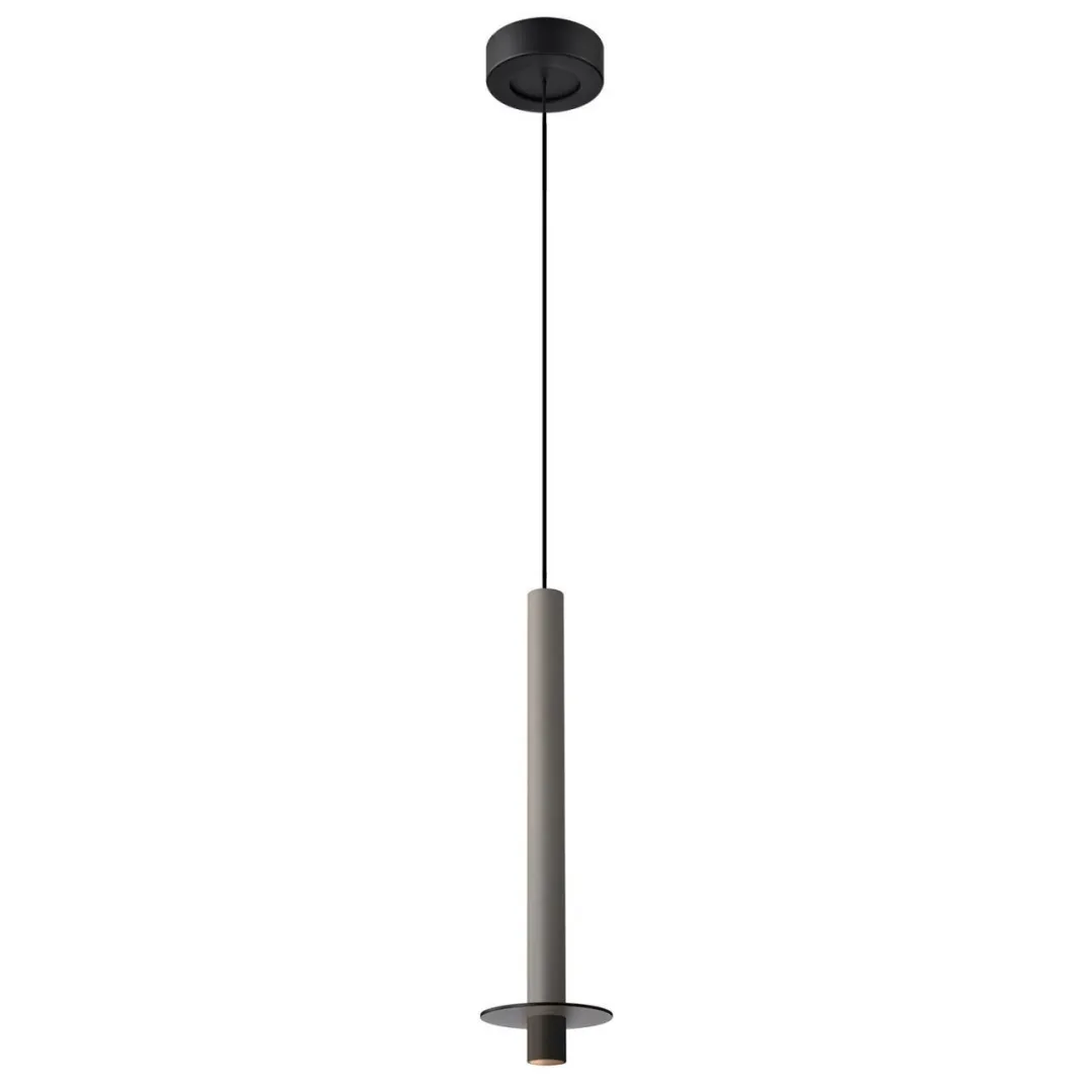 Металлический каркас черного цвета, плафон из алюминия в форме тонкого удлиненного цилиндра в сером цвете, в нижней части подвеса расположен светодиодный источник света, регулируемая высота.