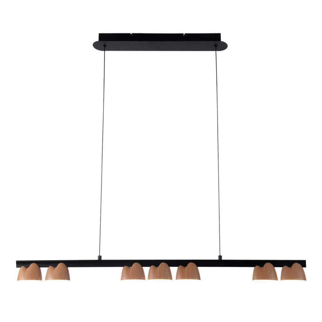Металлический каркас черного матового цвета, плафоны цвета дерева, прозрачный акрил с узором, регулируемая высота.