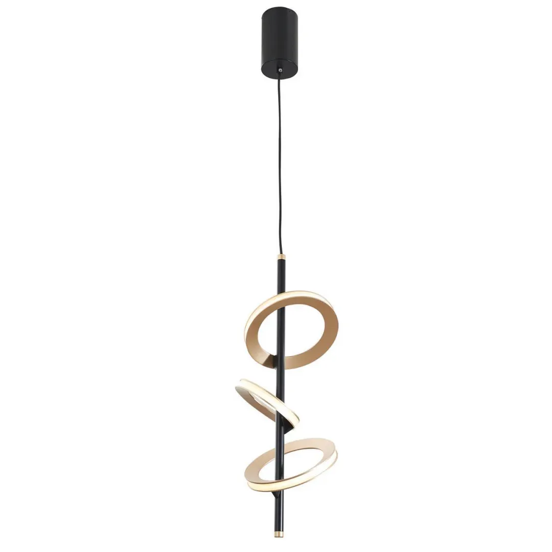 Металлический каркас черного цвета, объемные кольца цвета матовое золото, закреплены под разным углом к каркасу светильника, светятся по периметру благодаря встроенной ленте LED, Регулируемая высота.