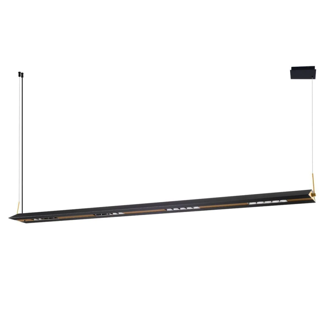 Подвесная люстра в скандинавском стиле, гнездовая структура источника света, сочетание черного каркаса с деревянным и латунным декором, регулируемая высота.