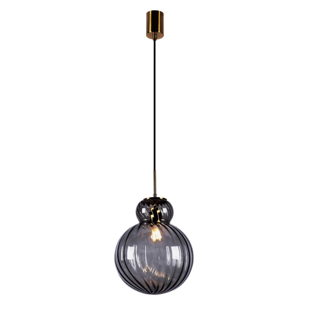 Подвес с плафоном из выдувного дымчатого фактурного стекла, каркас в цвете латунь, цоколь Е14, регулируемая высота.