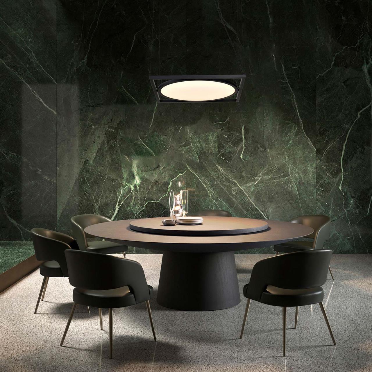 Металлический каркас матового черного цвета, поворотный элемент в форме диска с зеркалом с одной стороны и плоским рассеивателем из белого акрила с другой, регулируемая высота, LEDмодуль.