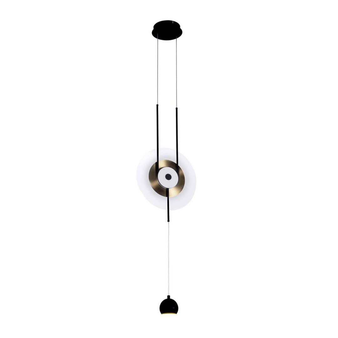 Металлический каркас в черном цвете, с двумя источниками света: первый источник декоративный латунный диск с акриловым плафоном и встроенной лентой LED по периметру диска, второй источник спот с направленным вниз потоком света.