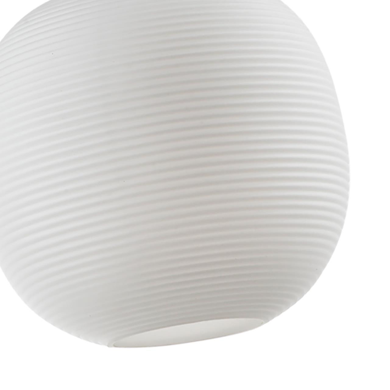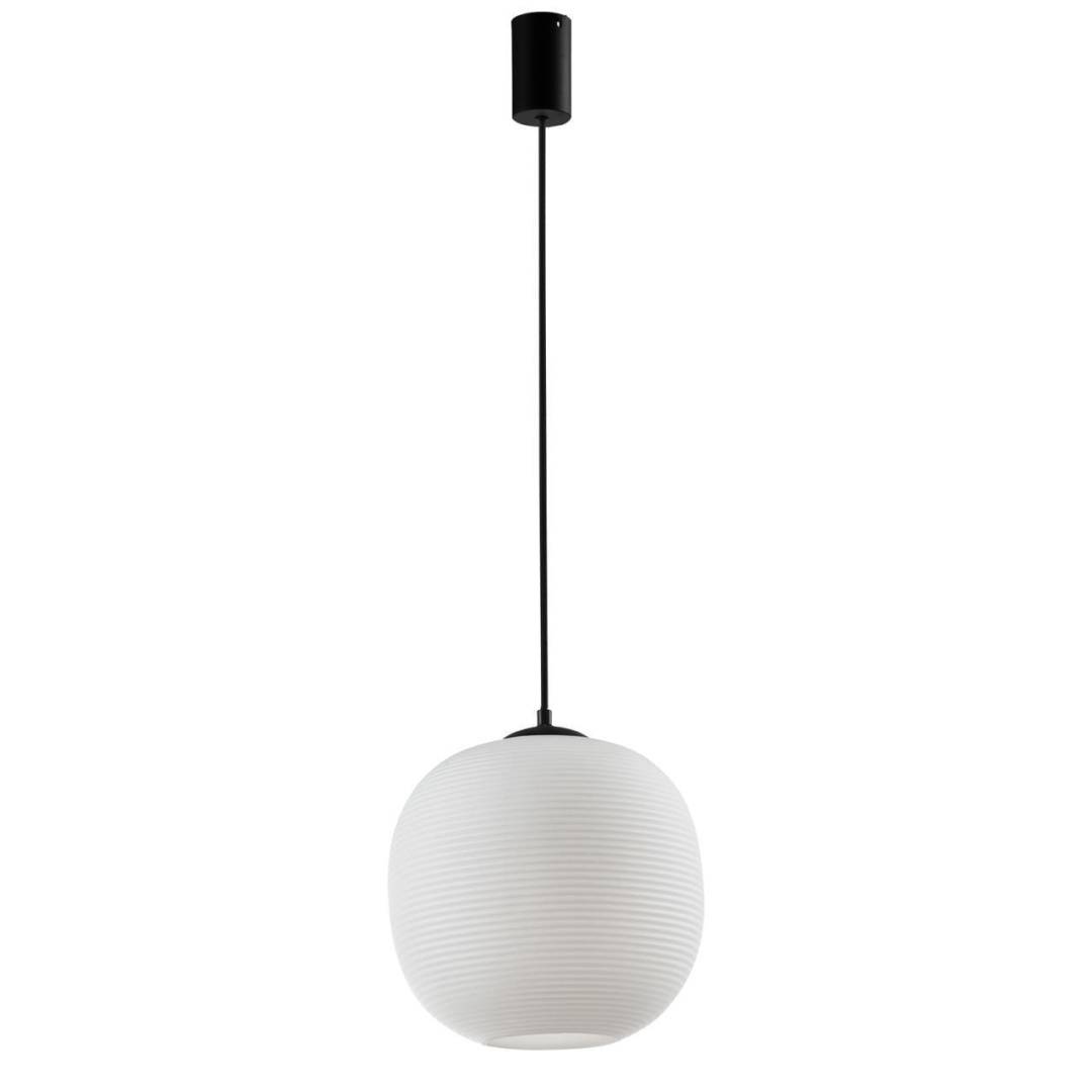 Металлический каркас черного цвета, плафоном из выдувного рифленого стекла опалового цвета, регулируемая высота, цоколь E27.