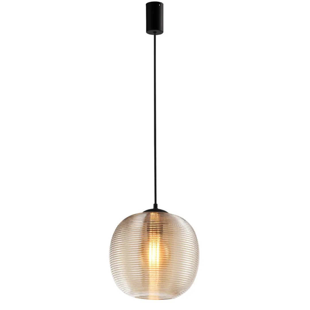 Металлический каркас черного цвета, с плафоном из выдувного рифленого стекла цвета хром, регулируемая высота, цоколь E27.
