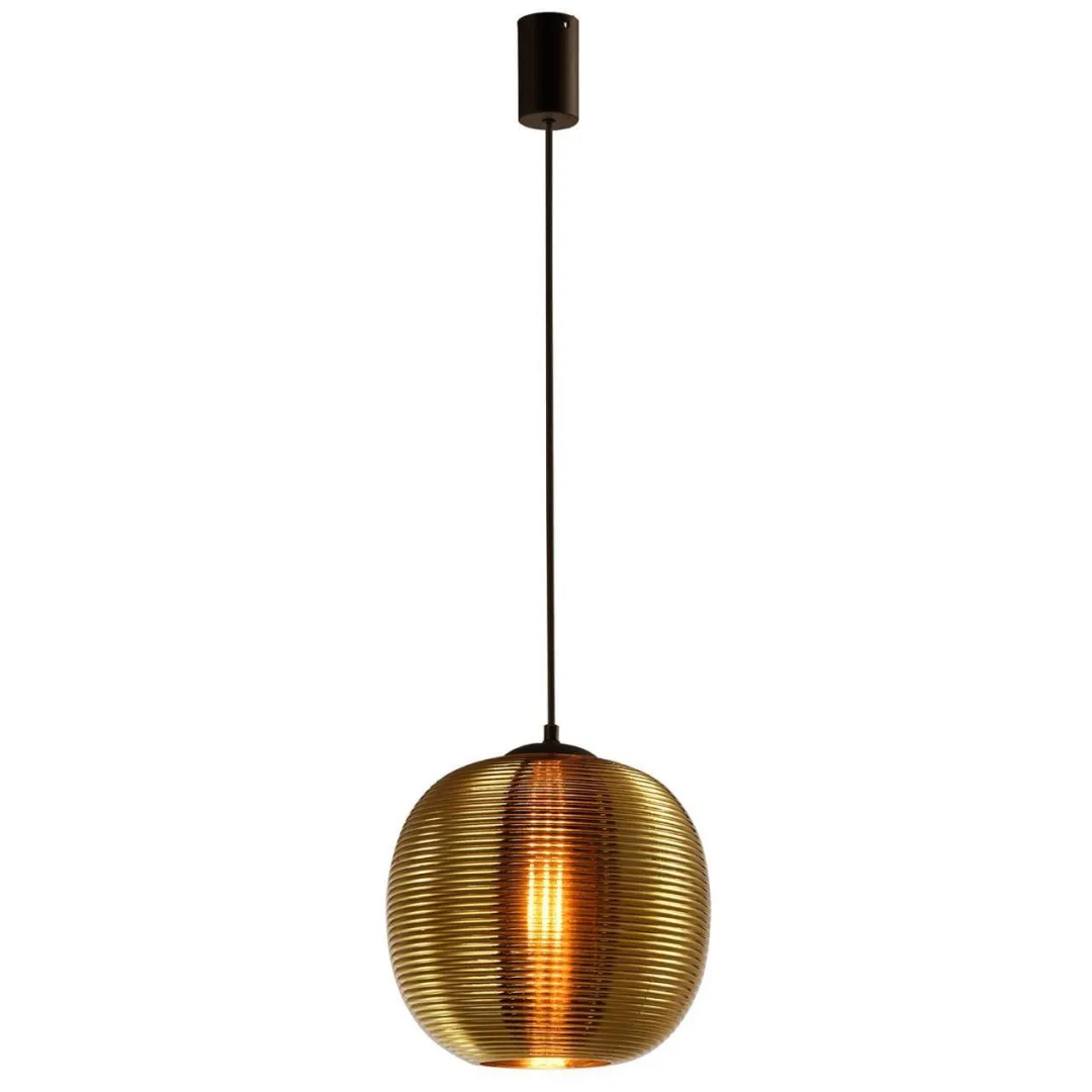 Металлический каркас черного цвета, с плафоном из выдувного рифленого стекла золотого цвета, регулируемая высота, цоколь E27.